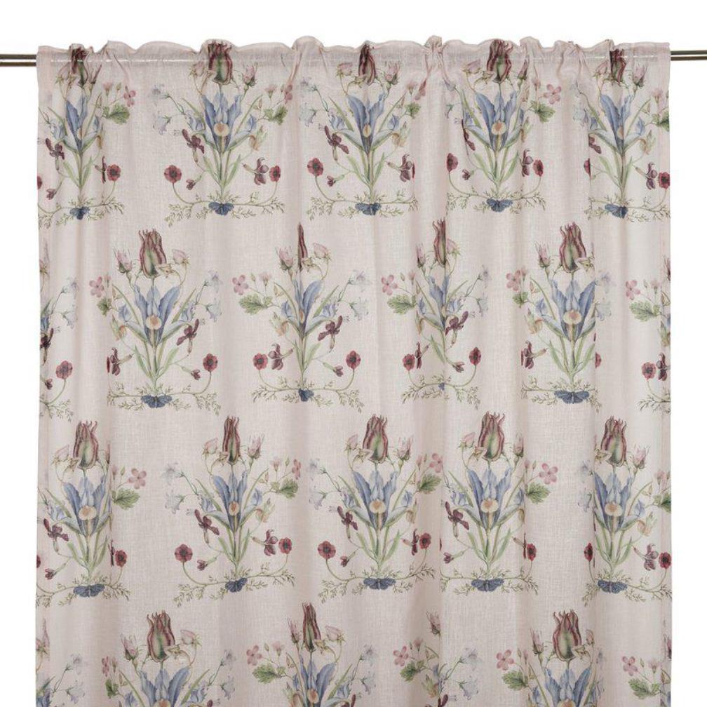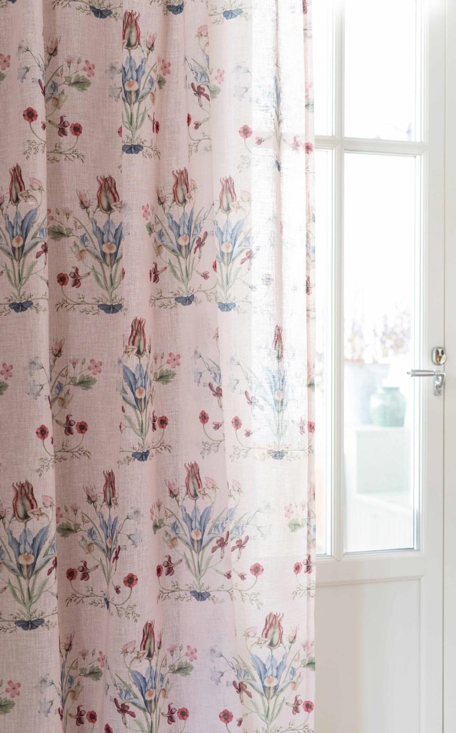 Gardin Vendela från Fondaco är tillverkad i ett tunt, skirt tyg med ett romantiskt blommönster av tulpanliknande motiv och mindre blommor på rosa botten. Mönstret går i mjuka toner av dämpat rött, blått och grönt och skapar ett klassiskt och tidlöst uttryck som passar i både sovrum och vardagsrum. Det lätta tyget släpper in ljuset på ett mjukt sätt och ger rummet en luftig och elegant känsla. Storlek: 140x250 cm. Säljes i 2-pack.
