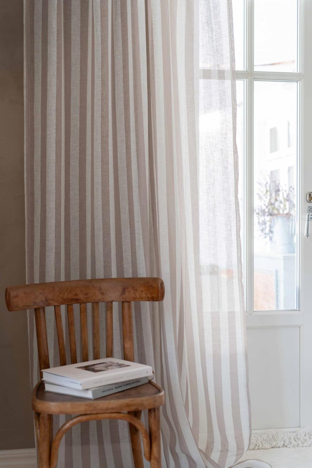 Gardin Disa från Fondaco har en stilren, klassisk design med breda, vertikala ränder som ger rummet en känsla av rymd och höjd. Den mjuka färgskalan med linnebeige ränder skapar ett harmoniskt intryck som passar både moderna hem och lantliga miljöer. Tyget är skirt och släpper igenom ljuset på ett mjukt sätt, vilket ger ett behagligt och luftigt intryck i rummet. Storlek: 135x280 cm. Säljes i 2-pack.