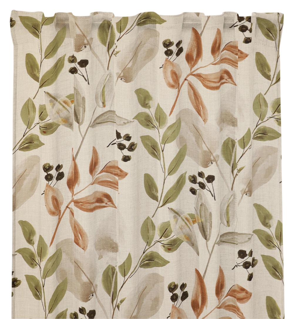 Gardin Odessa från Redlunds har ett vackert botaniskt mönster som för tankarna till naturens lugn. Bladen går i en varm terracottafärg och en mjuk, dämpad olivgrön nyans, vilket ger mönstret liv och variation. Några blad är nästan helt beige eller sandfärgade och tillför en vacker kontrast. Bottenfärgen i ljus sand skapar en jordnära och ombonad känsla som gör gardinen lätt att kombinera med övrig inredning.