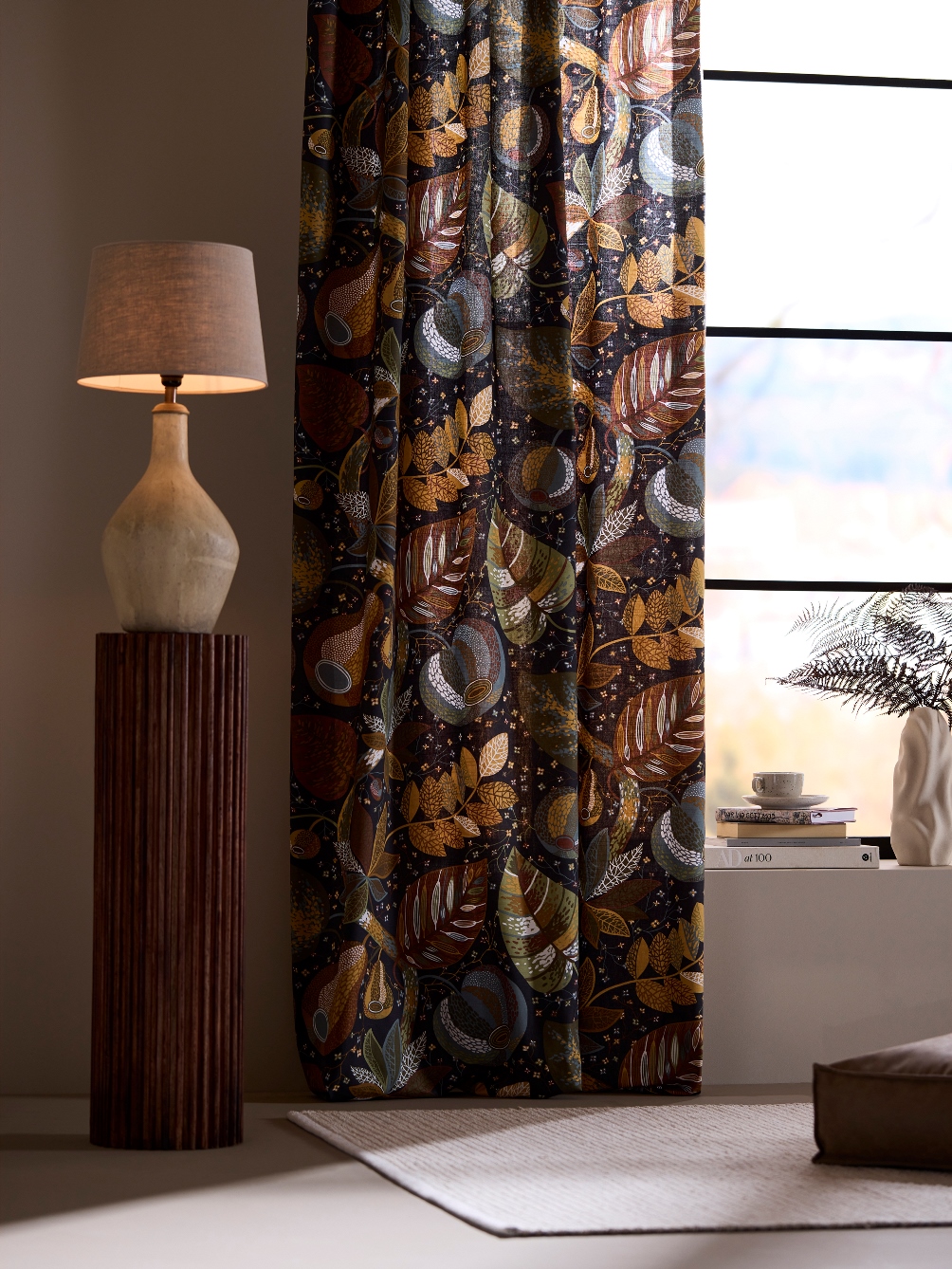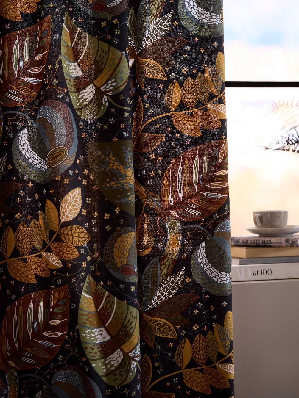 A & E gardin från Svanefors är tillverkad i bomull och har ett vackert tryckt mönster med blad och frukter. Med sin rostfärgade ton tillför den både värme och liv till rummet och skapar en ombonad, hemtrevlig känsla som är perfekt för såväl köket som vardagsrummet i ditt hem. Gardinen har multiband som ger flera upphängningsmöjligheter och fållade långsidor och overlocksöm. Storlek: 145x250 cm. Säljes i 2-pack. Tvättråd: Maskintvätt 40°C.