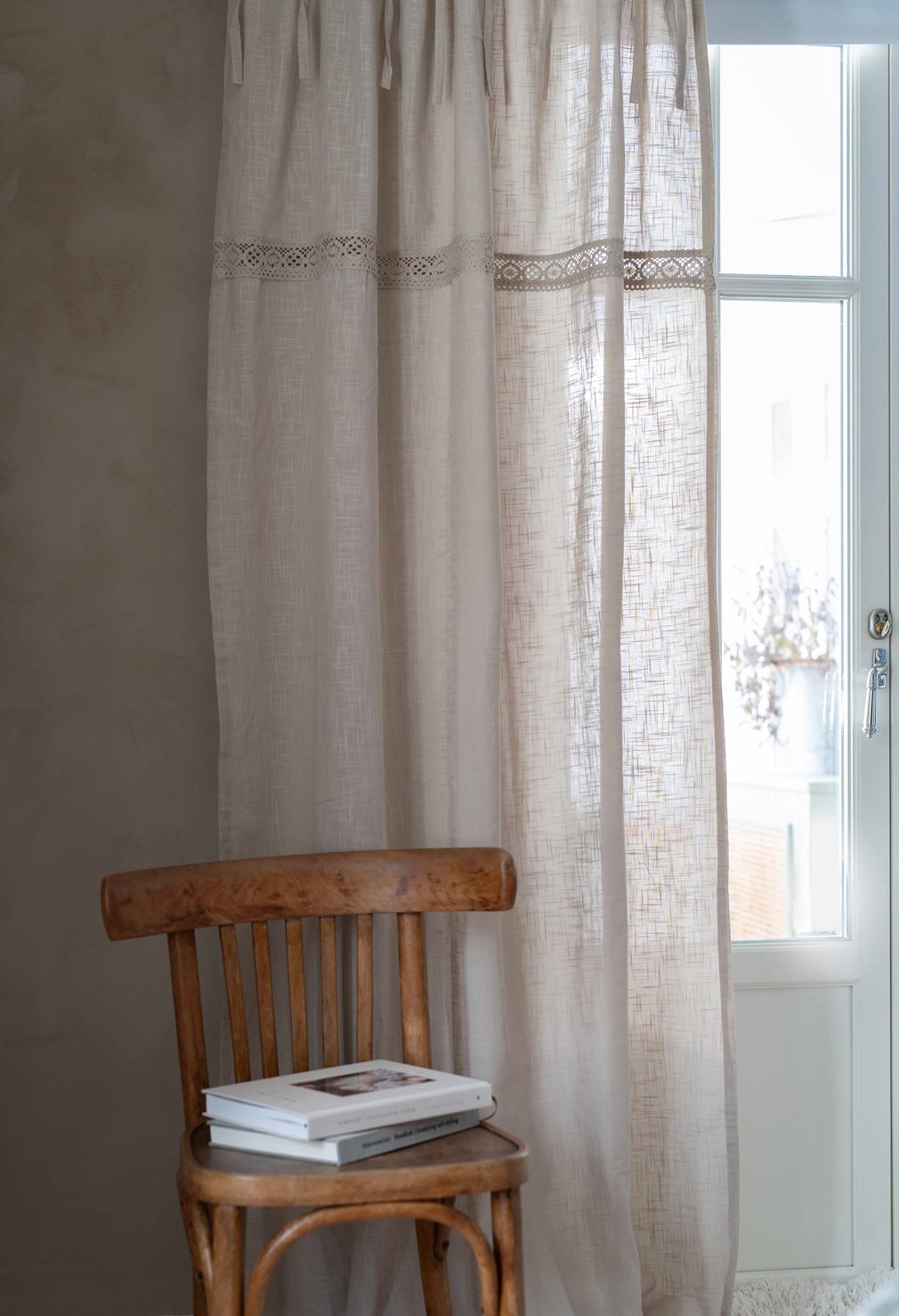 Knytbandslängder Sanna linnebeige från Fondaco har en lantlig och charmig design. De dekorativa spetsdetaljerna längs nedre kanten ger en romantisk och tidlös känsla. Tillverkad i bomull för en naturlig och ombonad atmosfär som passar perfekt i ditt hem. Den mjuka textilen skapar en inbjudande och värmande miljö, idealisk för kök eller vardagsrum. Mått: 115x240 cm.