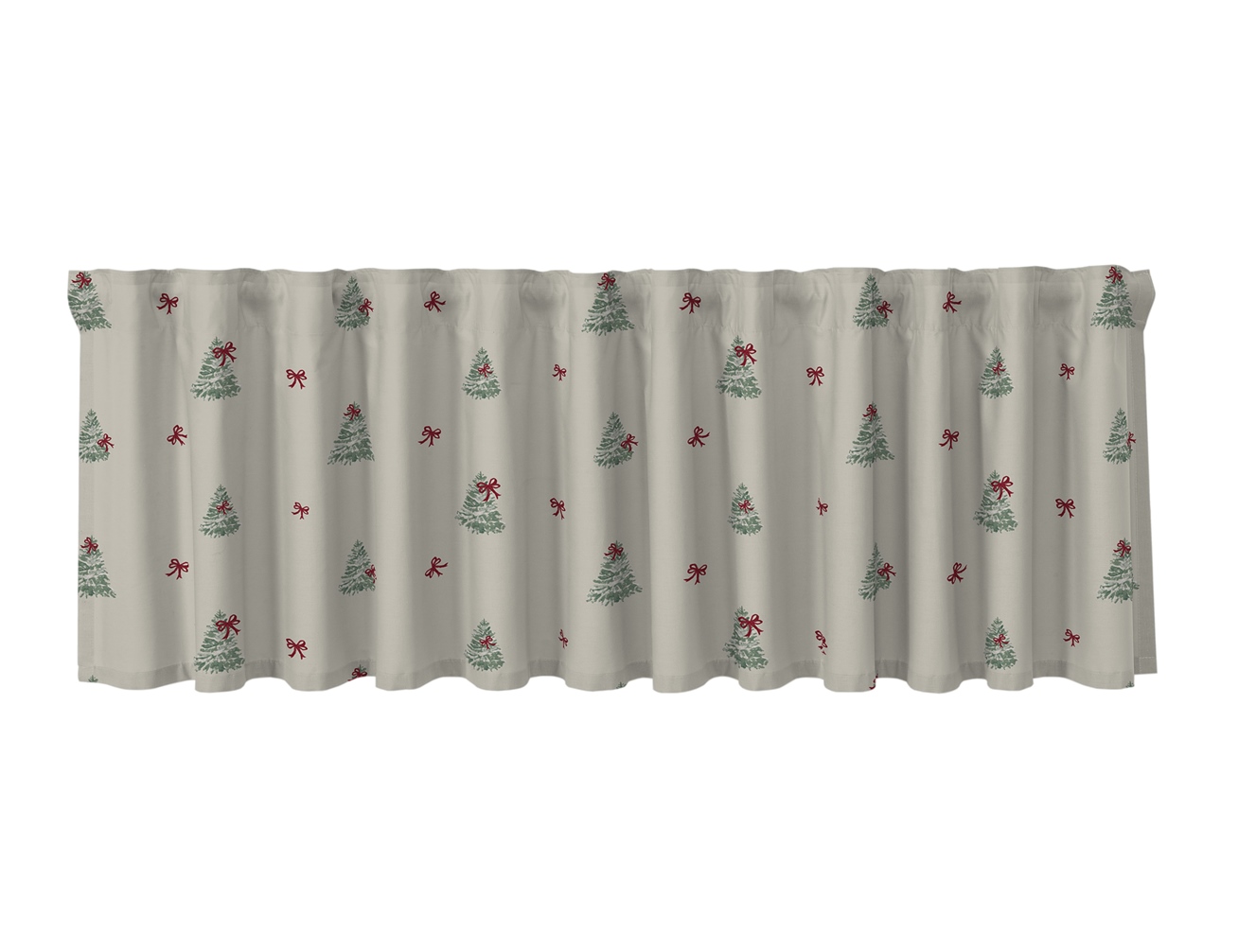 Gardinkappa Christmas Tree från Redlunds har ett fint mönster av små julgranar i en grön färg, var och en dekorerad med en liten röd rosett på en linnebeige botten. Mellan julgranarna pryder små, röda rosetter tyget, utspridda över hela gardinen och skapar en charmig, julig känsla i rummet. Gardinkappan är tillverkad av 100% bomull och passar perfekt för att skapa en mysig julstämning i hemmet.