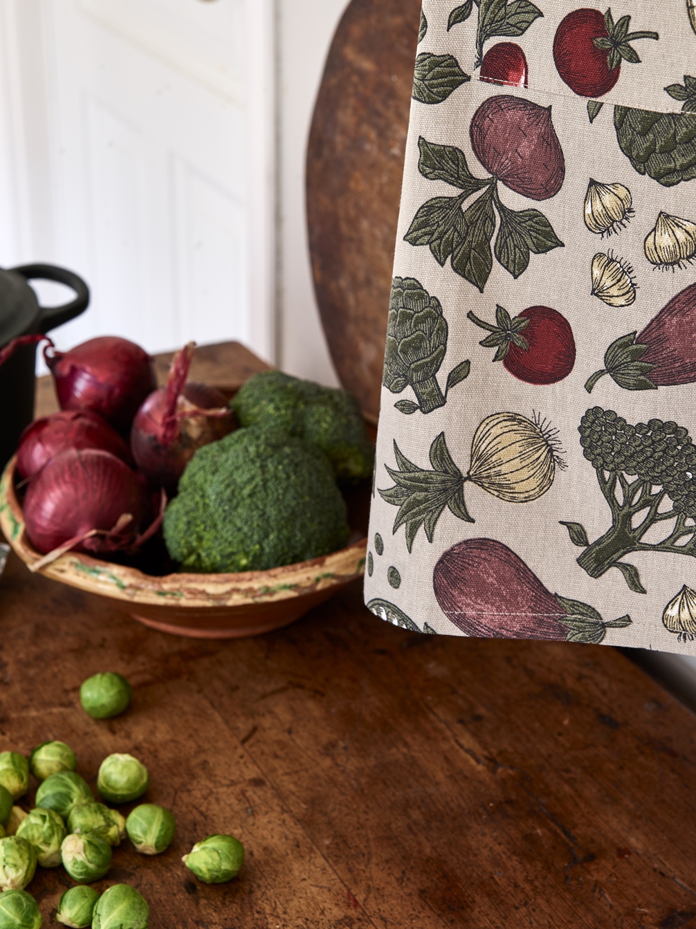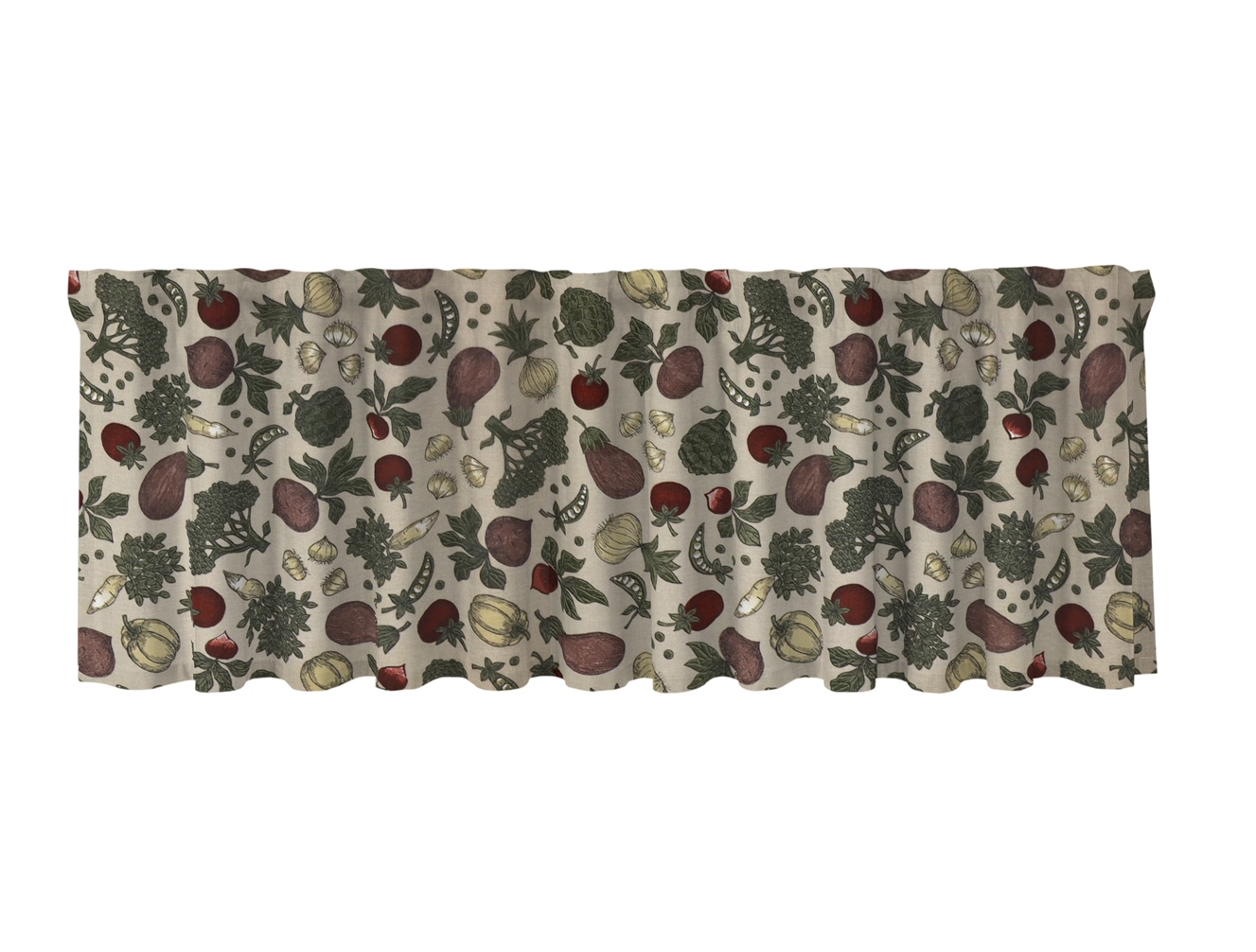 Gardinkappa Skördetid från Redlunds har ett vackert mönster som är inspirerat av säsongens skörd. Den har en linnebeige botten med motiv av olika grönsaker och frukter, som bland annat röda rödbetor, lök, tomater, potatis, ärtor och vitkål i dova färger som rött, grönt och brunt. Gardinkappan är tillverkad av 100% bomull och är designad av en svensk designer.