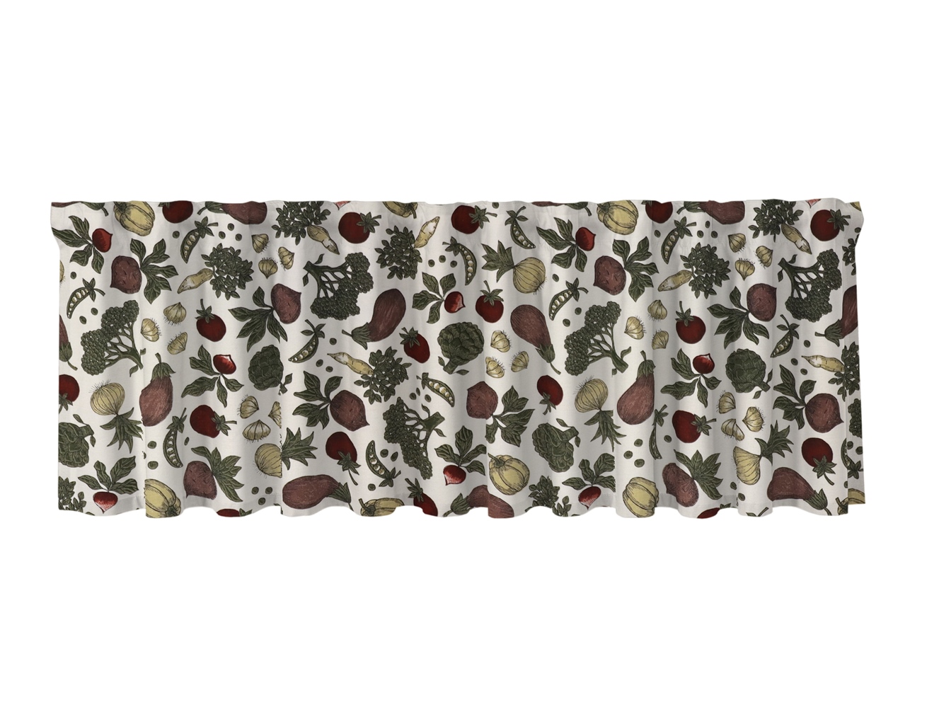 Gardinkappa Skördetid från Redlunds har ett vackert mönster som är inspirerat av säsongens skörd. Den har en vit botten med motiv av olika grönsaker och frukter, som bland annat röda rödbetor, lök, tomater, potatis, ärtor och vitkål i dova färger som rött, grönt och brunt. Gardinkappan är tillverkad av 100% bomull och är designad av en svensk designer.