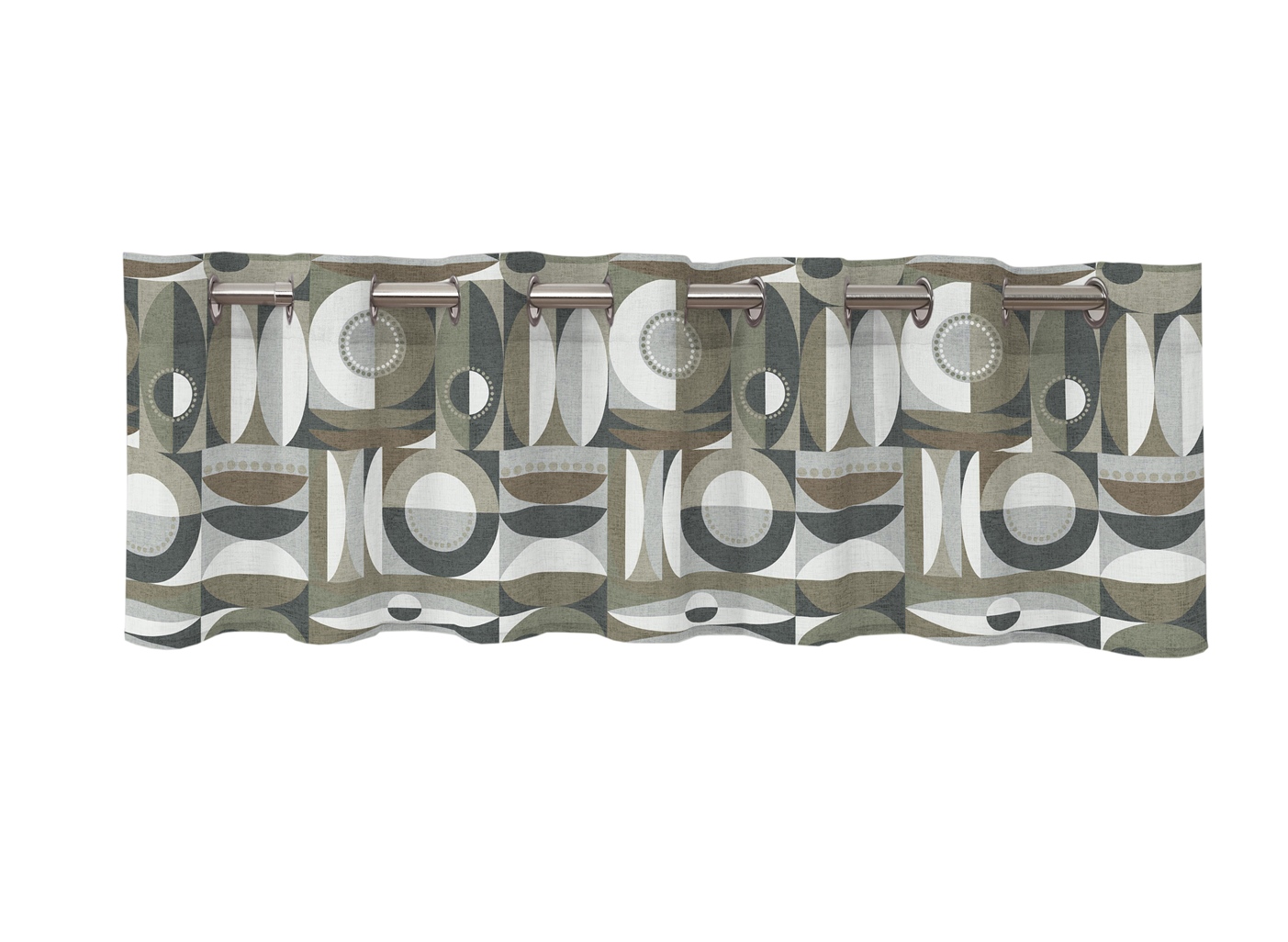 Öljettkappa Tord från Redlunds är tillverkad i bomull och har ett snyggt geometriskt mönster i retrostil. Grafiska former som cirklar, halvcirklar och rektangulära block skapar en spännande look. Mönstret i jordnära färger, med dova gröna toner, brunt och benvita inslag, ger värme och karaktär åt rummet.