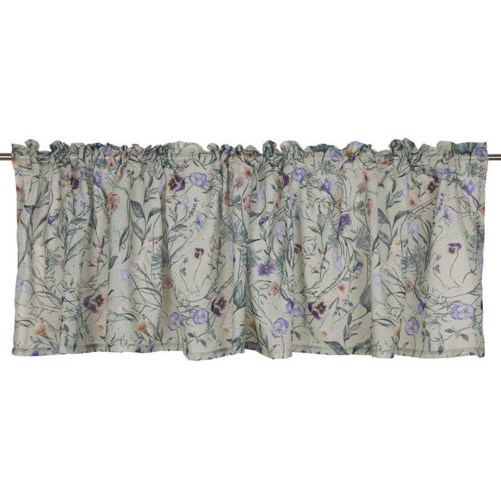 Gardinkappa Viola från Fondaco i tunt, skirt tyg med ett ljuvligt blommönster av violer och blad på grön botten. Tyget släpper in ljuset mjukt och skapar en luftig, romantisk känsla i rummet. De små violerna ger ett charmigt och klassiskt uttryck med en somrig touch. Storlek: 55x250 cm.