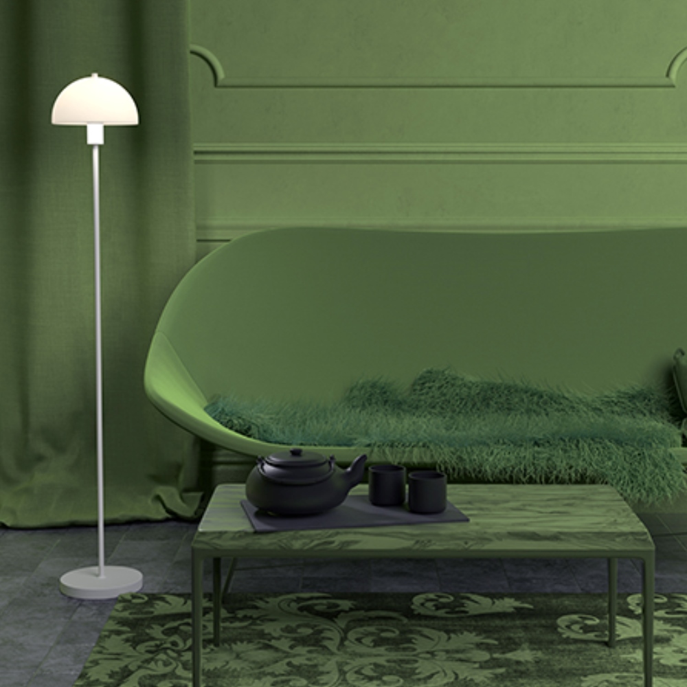 Med sin bas i vit metall får lampan en tidlös känsla som gör den till ett vackert inslag i rummet Den passar lika bra som solitär i ett hörn som bredvid en soffa eller fåtölj i vardagsrum, sovrum eller läshörna.