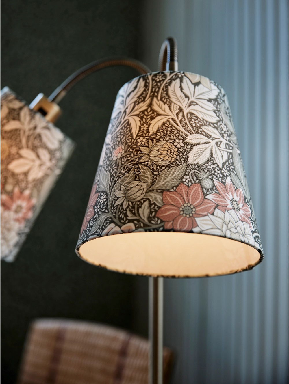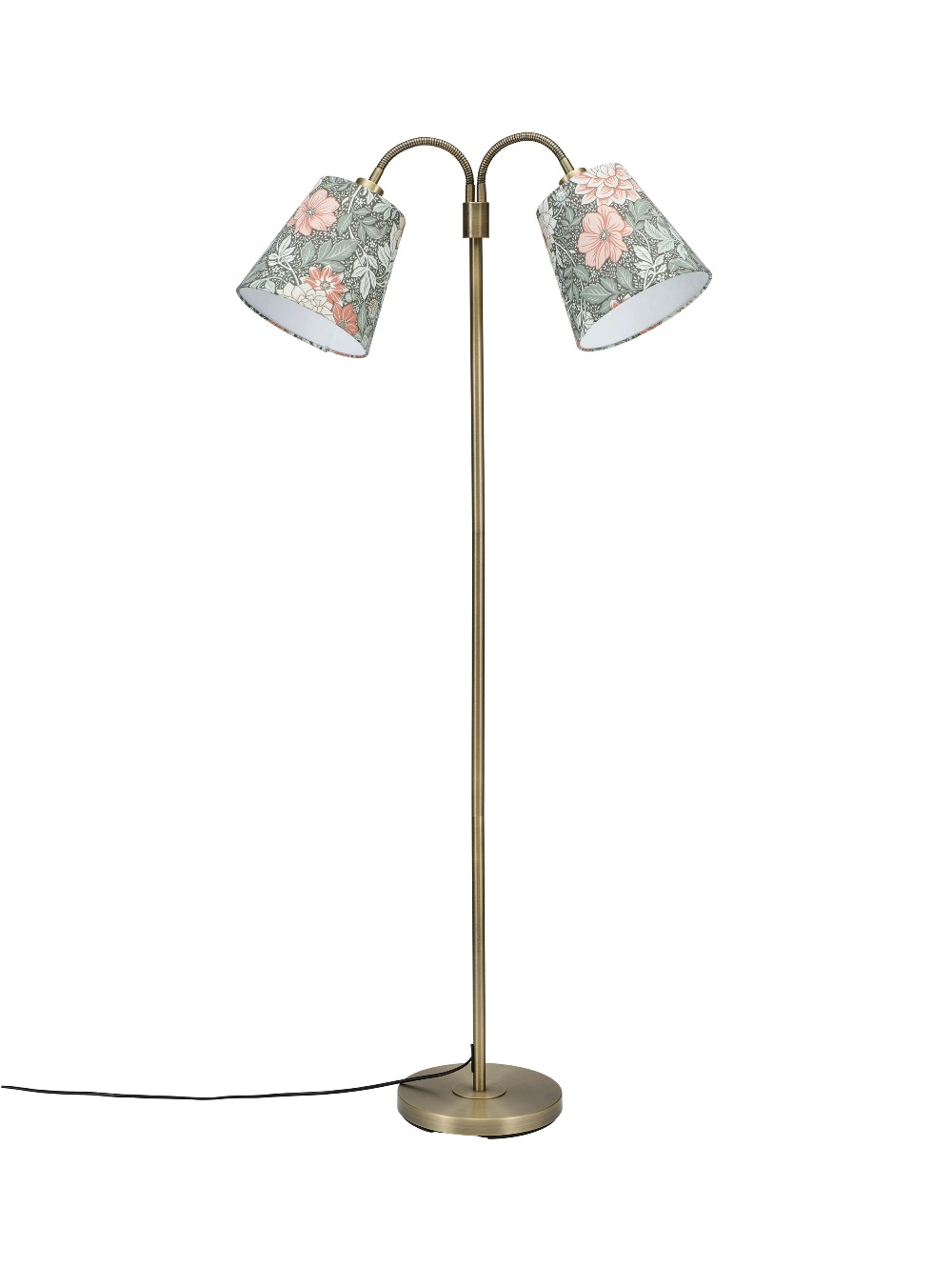 Golvlampa Amy från PR Home med en klassisk design i metall med två justerbara armar. Lampskärmarna är tillverkade av polyester och har det fint handmålade mönstret Dahlia Garden i en vacker grön och mildrosa färgskala. Mönstret är skapat av designern Jenny Hahne Gadd för Boråstapeter och föreställer praktfulla dahlior och sirliga blad som för in en känsla av natur och blomstrande elegans i ditt hem. Den levereras med en 1,9 meter sladd med väggkontakt. Till Amy rekommenderas en ljuskälla med en E27 sockel, max 40W. Ljuskälla ingår ej.