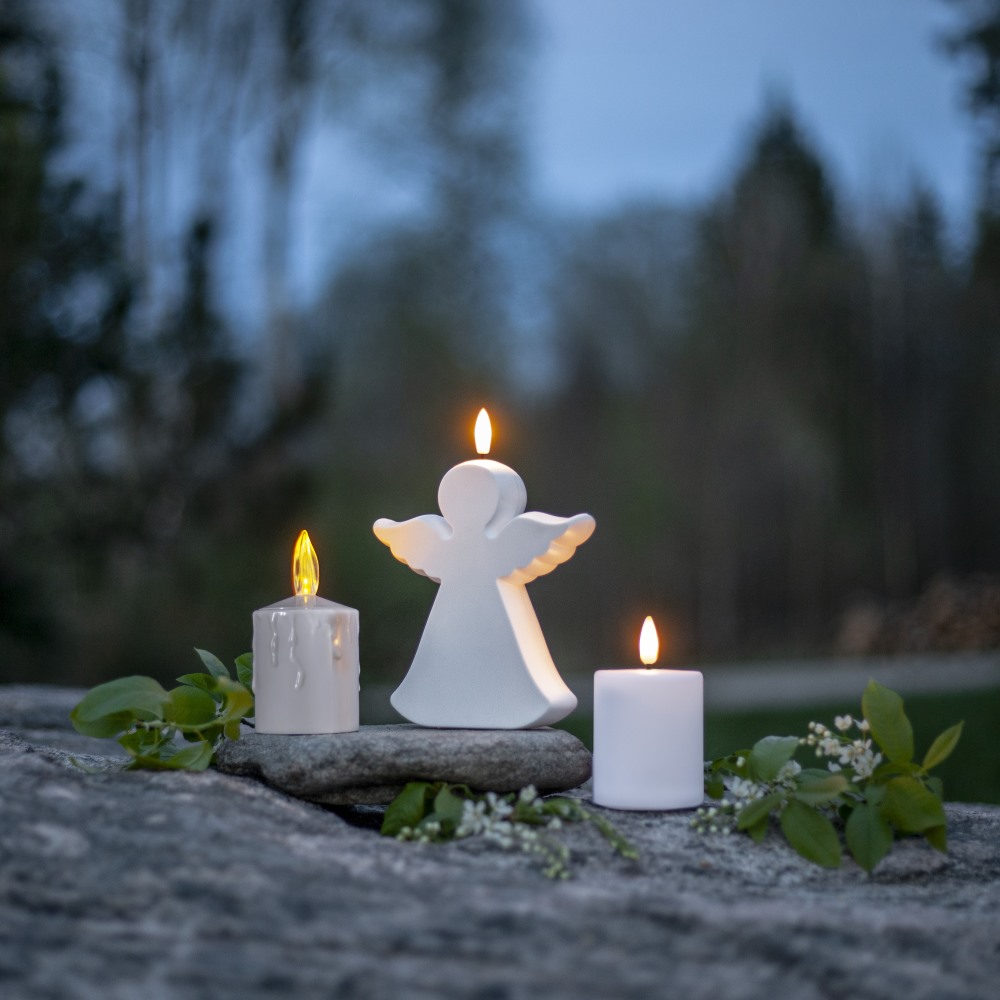 Gravljus Flamme Angel från Star Trading är tillverkat i vit plast, vilket gör det tåligt mot väder och vind. Ljuset är vackert utformat som en ängel och den stilrena designen ger ett mjukt och rogivande sken. Går bra att använda både inne och ute. Den inbyggda timern gör användningen enkel och bekväm – ljuset tänds och släcks automatiskt, så du slipper tänka på det. Drivs 2st AA batterier, ingår ej. Storlek: 13,5x18 cm.