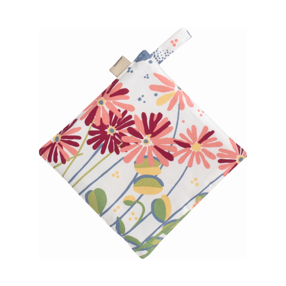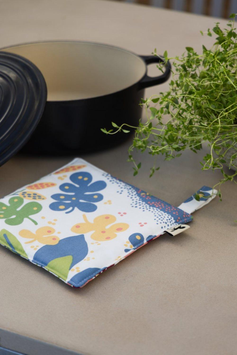 Grytlapp Ailanthus från Almedahls är tillverkad i 100% bomull i en ljus, multifärgad nyans. Den är vadderad för att ge ett effektivt värmeskydd och gör matlagningen både tryggare och smidigare. Det klassiska Ailanthus-mönstret, formgivet av Louise Carling på 1970-talet, kännetecknas av organiska bladformer i harmoniska toner som skapar ett fräscht och tidlöst uttryck. Grytlappen har en praktisk ögla som gör den enkel att hänga upp. Storlek: 23x23 cm.