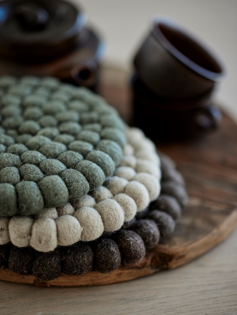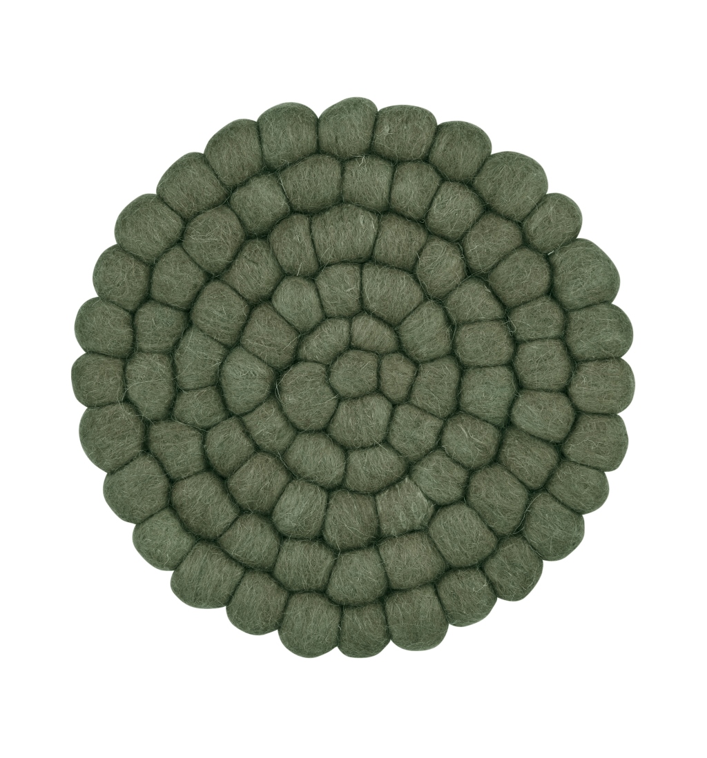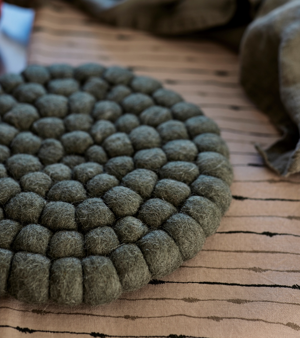 Grytunderlägg Nisha mossgrön från Svanefors är tillverkat i ull av ihopsydda, tovade bollar. Underlägget skyddar bordet mot varma kastruller och grytor och blir en elegant detalj i dukningen.