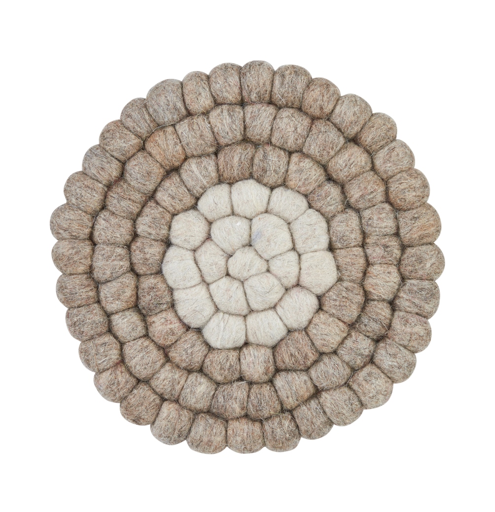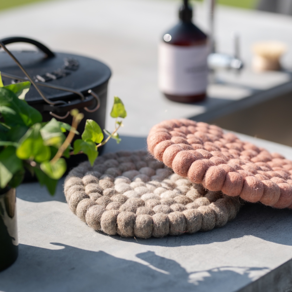 Grytunderlägg Nisha multi från Svanefors är tillverkat i ull av ihopsydda, tovade bollar. Underlägget skyddar bordet mot varma kastruller och grytor och blir en elegant detalj i dukningen.