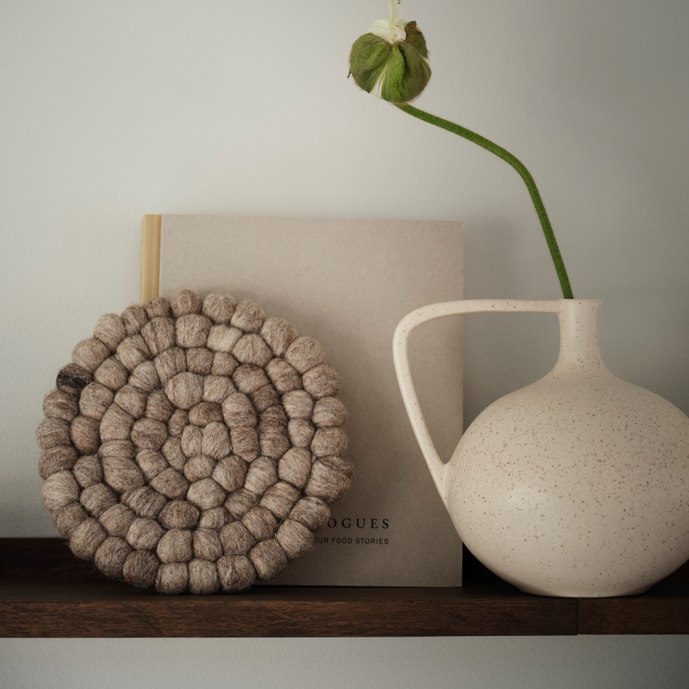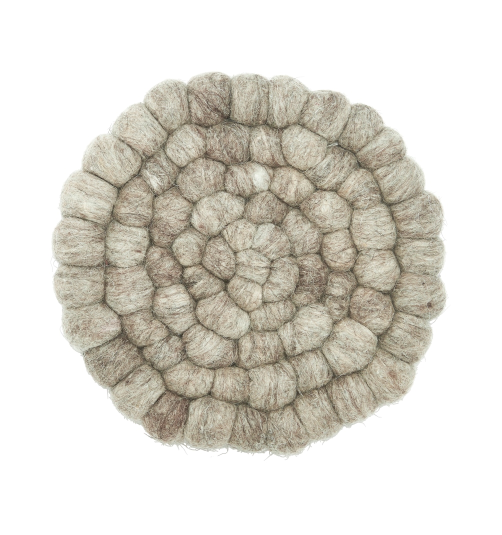Grytunderlägg Nisha nougat från Svanefors är tillverkat i ull av ihopsydda, tovade bollar. Underlägget skyddar bordet mot varma kastruller och grytor och blir en elegant detalj i dukningen.