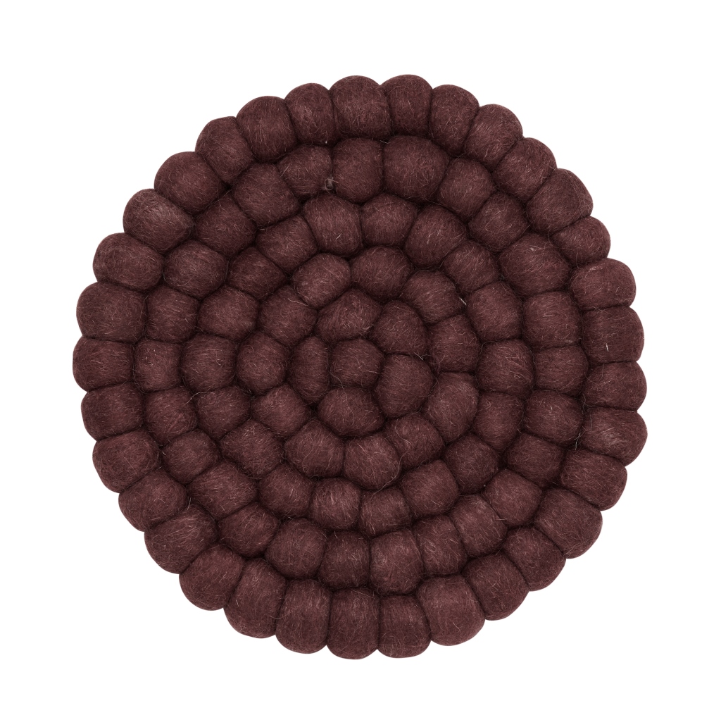 Grytunderlägg Nisha vinröd från Svanefors är tillverkat i ull av ihopsydda, tovade bollar. Underlägget skyddar bordet mot varma kastruller och grytor och blir en elegant detalj i dukningen.