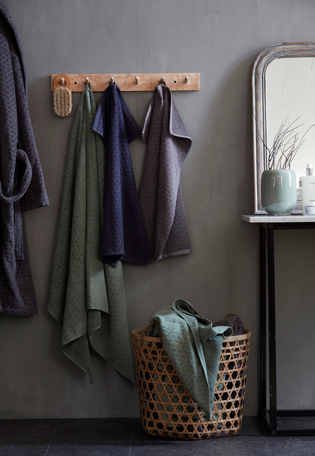 Handduk Diamond från Nina Royal i en tidlös marinblå färg som är tillverkad i mjuk och behaglig velourfrotté. Det diskreta rutmönstret ger handduken en stilfull och exklusiv känsla som lyfter badrummet.