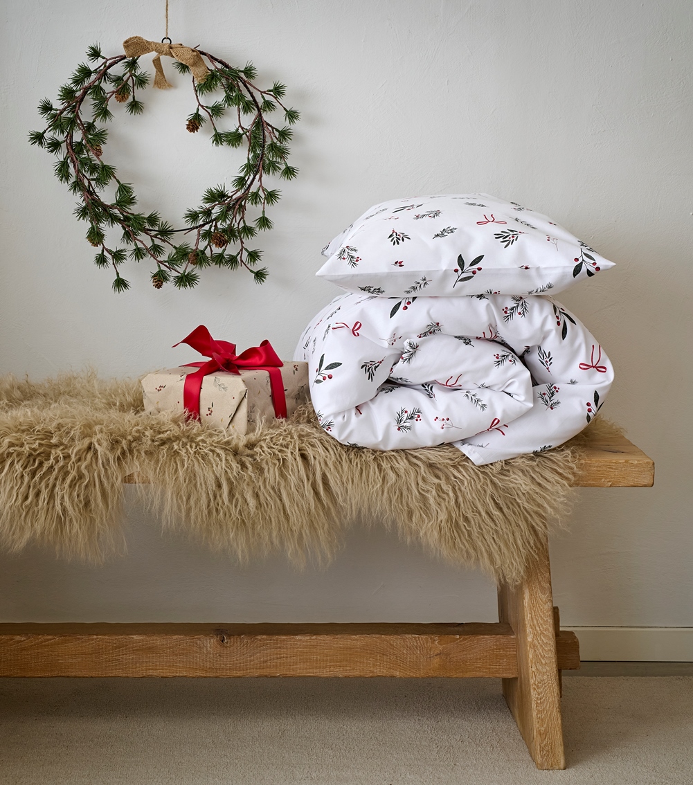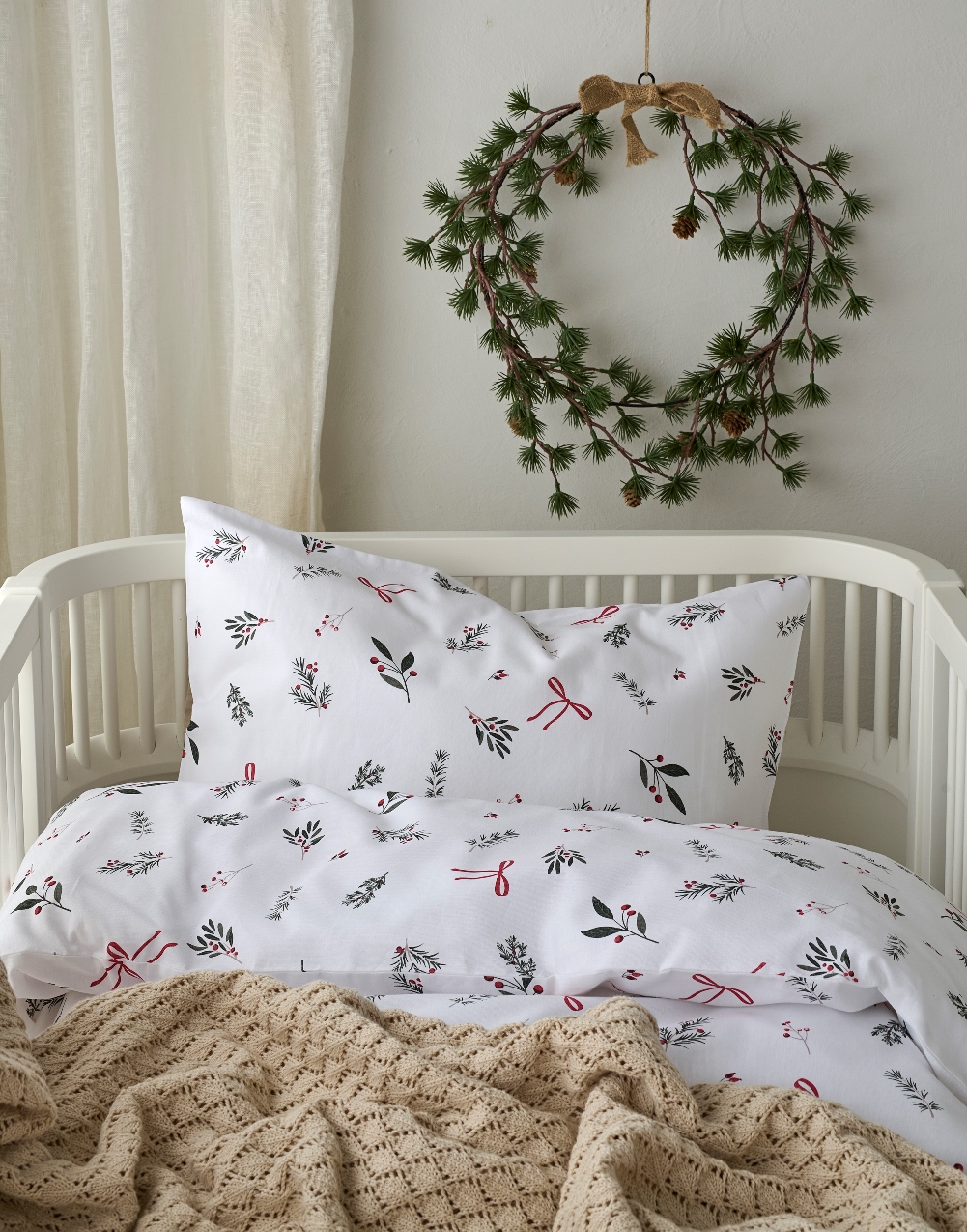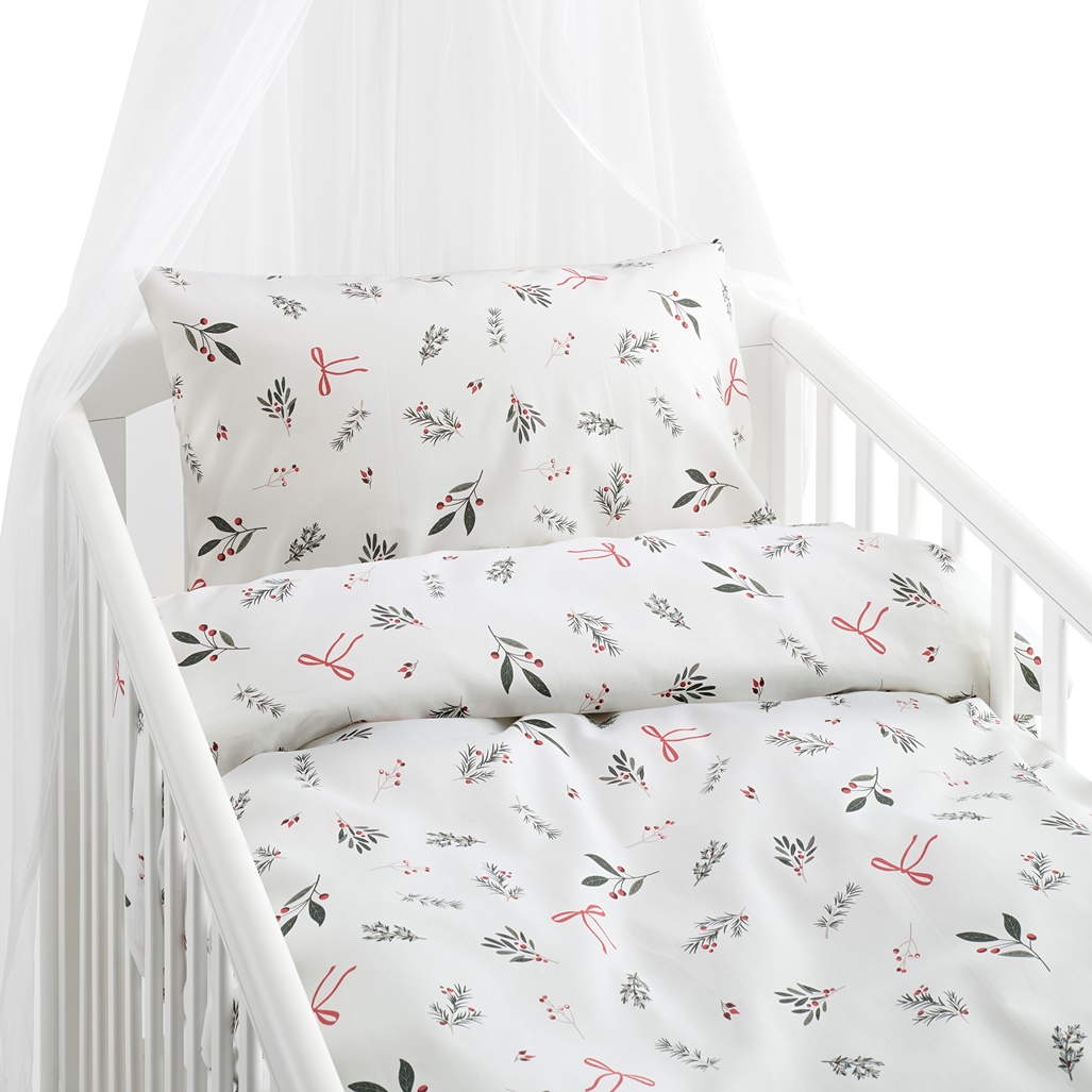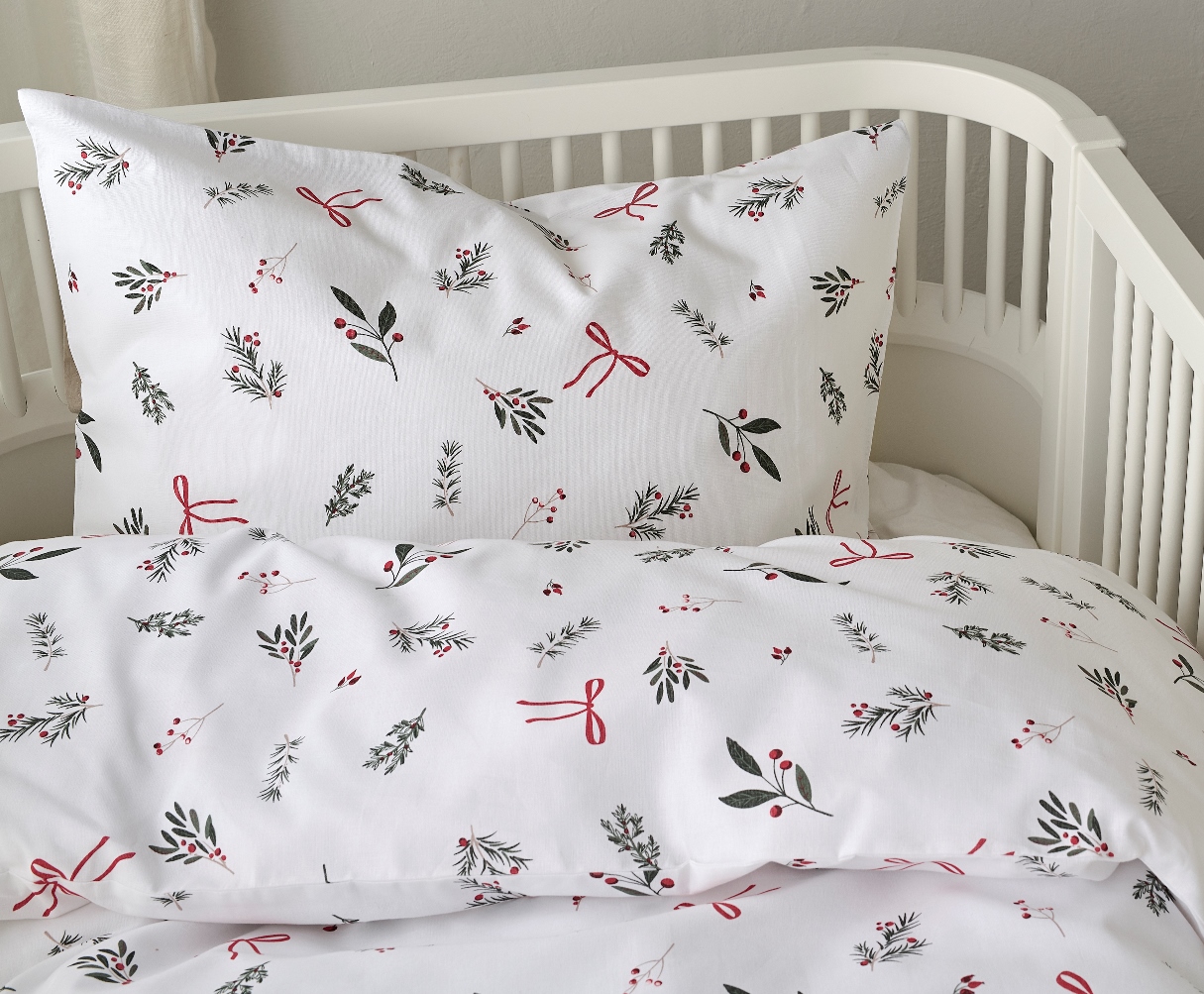Påslakanset Julkvisten för spjälsäng från Borganäs of Sweden med gröna kvistar, röda bär och rosetter på vit botten. Stilrent och juligt för barnrummet. Bäddsetet är tillverkat i 100% mjuk och behaglig bomull som gör bäddningen extra inbjudande. Det är perfekt för dig som vill addera både komfort och julkänsla till barnrummet.
