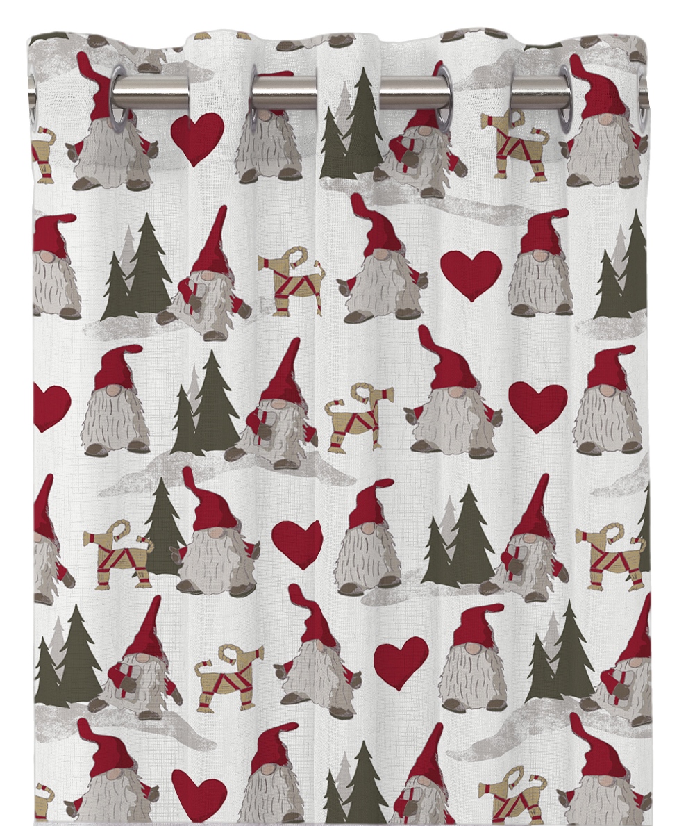 Öljettgardin Noel från Redlunds är en charmig julgardin i bomull, perfekt för att skapa en festlig stämning i hemmet. Mönstret består av gulliga tomtar med röda tomteluvor, julbockar, gröna julgranar och röda hjärtan på en vit botten. Den är tillverkad i bomull med en elegant slubeffekt, en speciell vävteknik där trådar av varierande tjocklek ger en levande, naturlig struktur med en unik och exklusiv känsla.