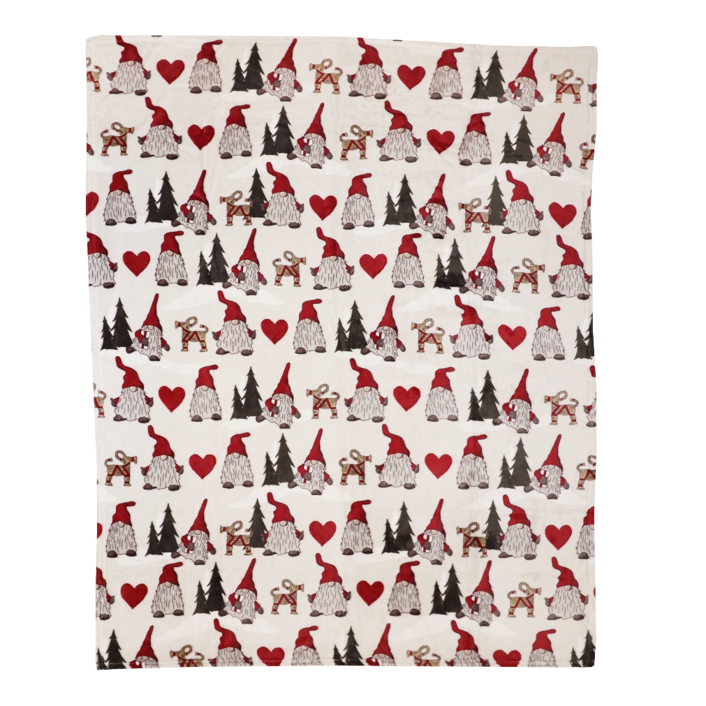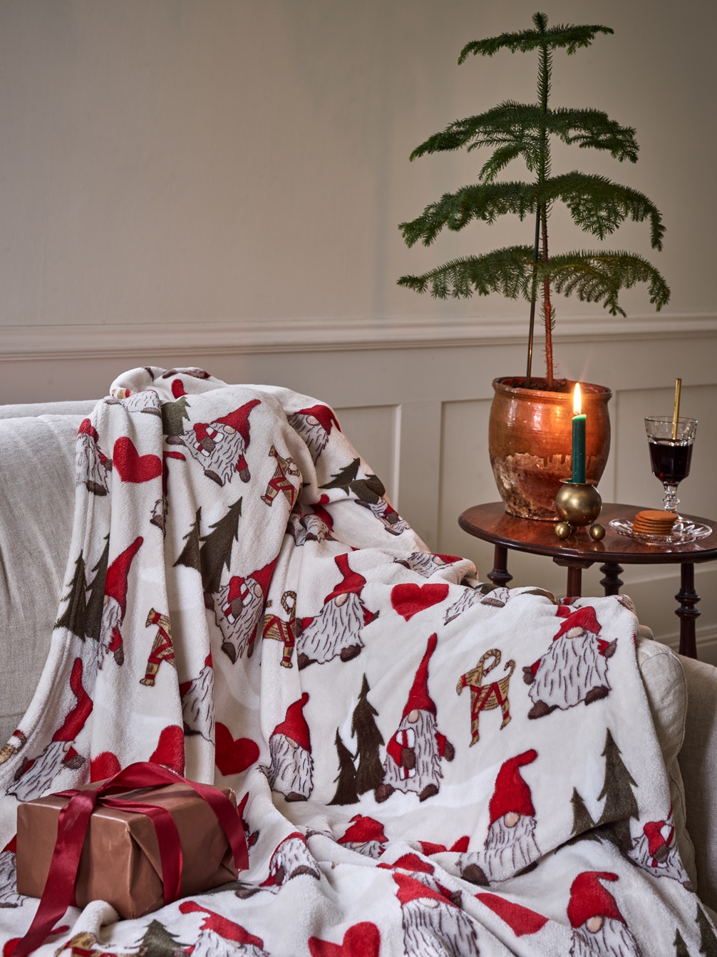 Pläd Noel från Redlunds har ett charmigt julmönster med tomtar i röda luvor, julbockar, bruna granar och röda hjärtan på en ljus botten. Den klassiska och mysiga designen skapar en festlig och ombonad atmosfär i hemmet under julen, perfekt för soffan, fåtöljen eller som dekorativ detalj.