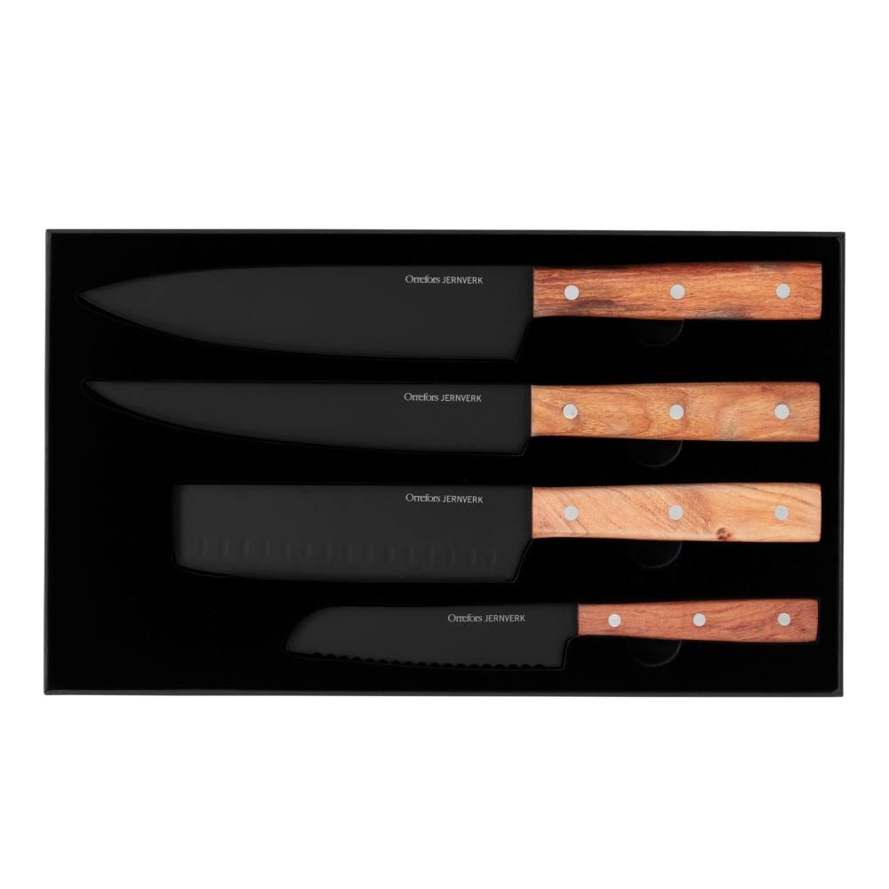 Knivset 4-pack från Orrefors Jernverk har en unik design med svarta knivblad och trähandtag av rosenträ. Detta eleganta knivset kombinerar stilren estetik med hög funktionalitet och passar lika bra i det moderna köket som i det klassiska. Förpackning i en fin presentkartong.