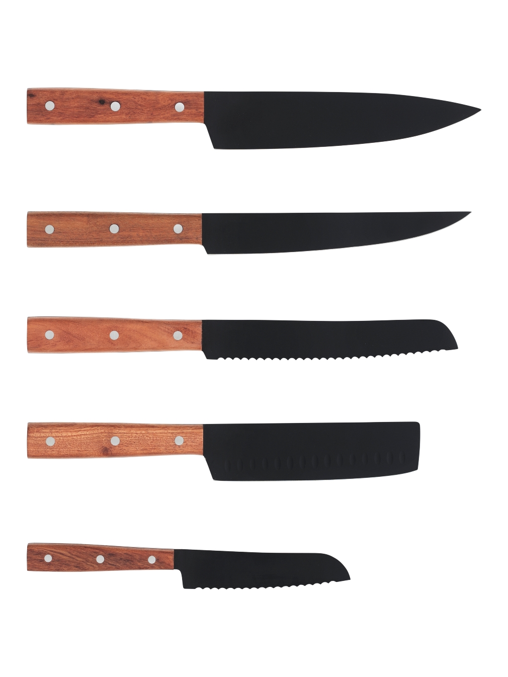 Knivset 5-pack från Orrefors Jernverk har en unik design med svarta knivblad och mörka trähandtag av odlat rosenträ. Detta eleganta knivset kombinerar stilren estetik med hög funktionalitet och passar lika bra i det moderna köket som i det klassiska. Förpackning i en fin presentkartong.
