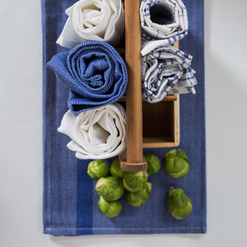Kökshandduk Erick från Fritz Magnus har en stilren design i kraftig kvalitet med vacker fiskbensstruktur som ger ett rustikt och gediget intryck. Den blå färgen med matchande rand ger en klassisk känsla, och tack vare det slitstarka materialet passar den lika bra som servett, kocksläng eller till att duka med. Storlek: 50x80 cm.
