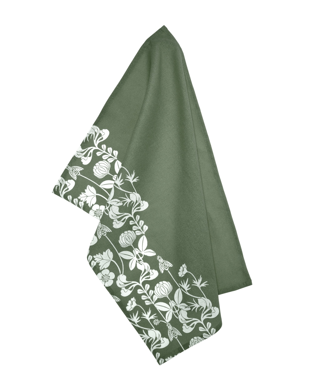 Kökshandduk De Mina mossgrön från Svanefors är tillverkad i ett mjukt bomullstyg med ett vackert tryckt botaniskt mönster. Designen, som heter De Mina, är skapad av Carl Larsson och kommer från försättningsbladet på några av hans böcker (bland annat boken 'De mina'). Den här köksduken har en färgmatchad hank och blir en fin och historisk detalj i köket. Storlek: 50x70 cm.