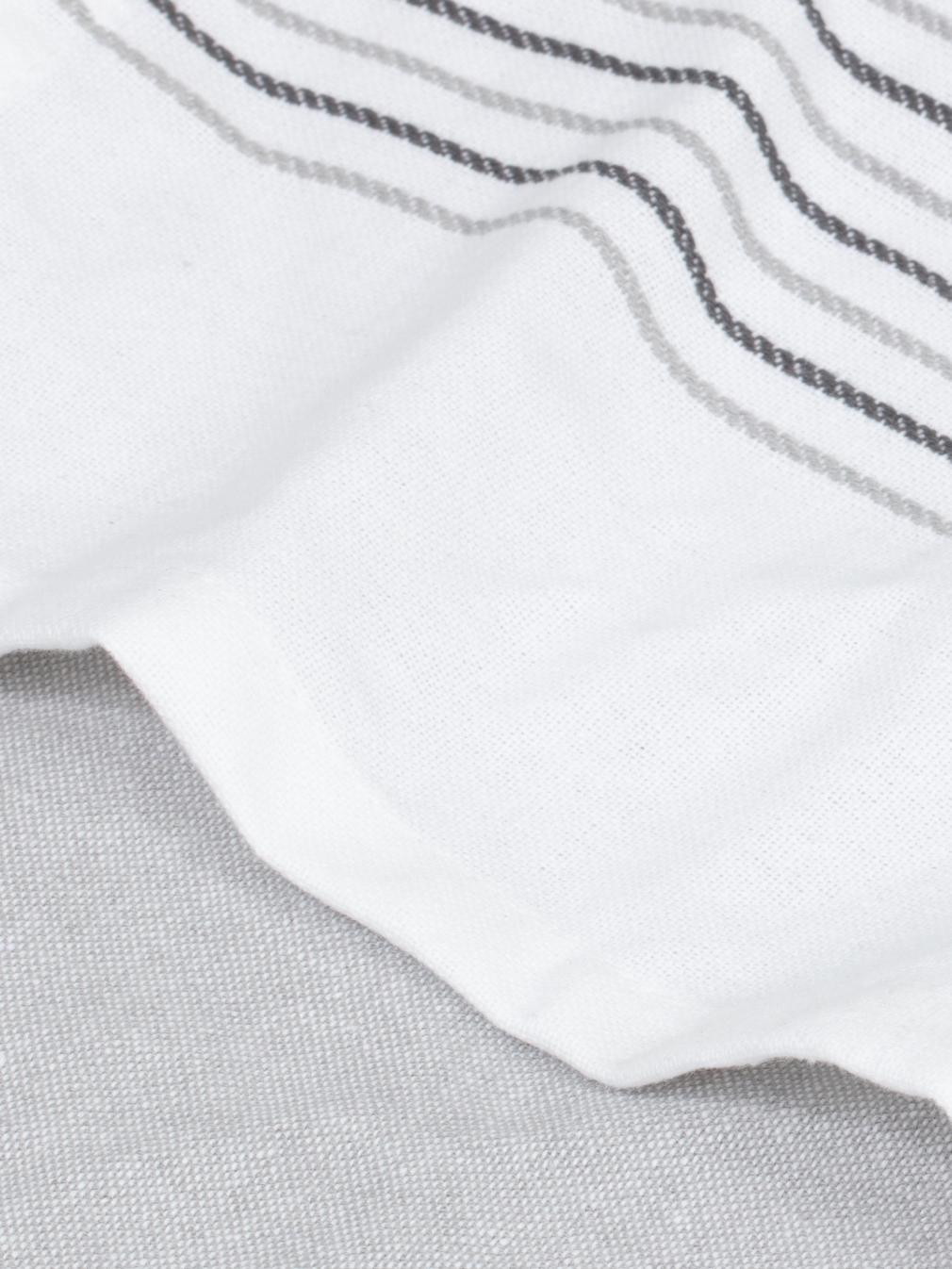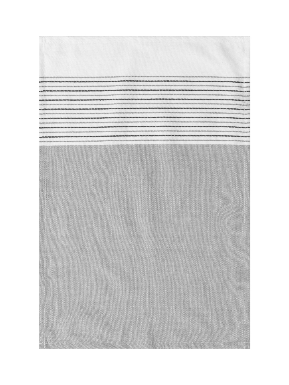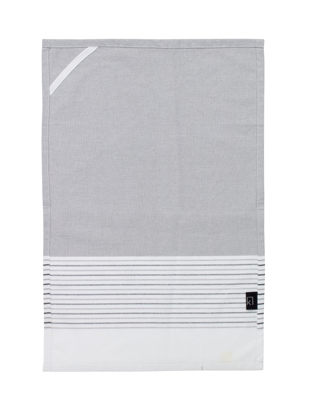 Kökshandduk Stripe från Kosta Linnewäfveri är tillverkad i återvunnet material och har ett elegant randigt mönster i olika grå nyanser. De klassiska ränderna ger ett livfullt men stilrent uttryck som passar i både moderna och lantliga kök.