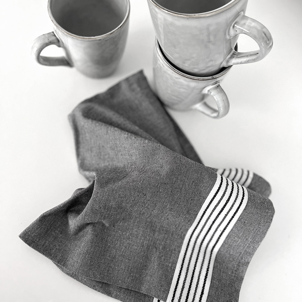 Kökshandduk Roy från Fritz Magnus har en stilren design och är tillverkad helt i återvunnen bomull. Den har en vacker gråmelerad nyans som ger ett elegant och tidlöst intryck, med vita bårder som tillför en subtil kontrast och lyxig känsla. Fin både som servett och kökshandduk. Praktiska hängare på båda kortsidorna för enkel upphängning. Storlek: 50x70 cm.
