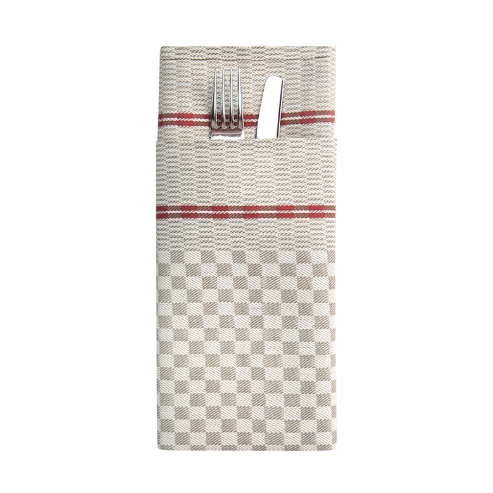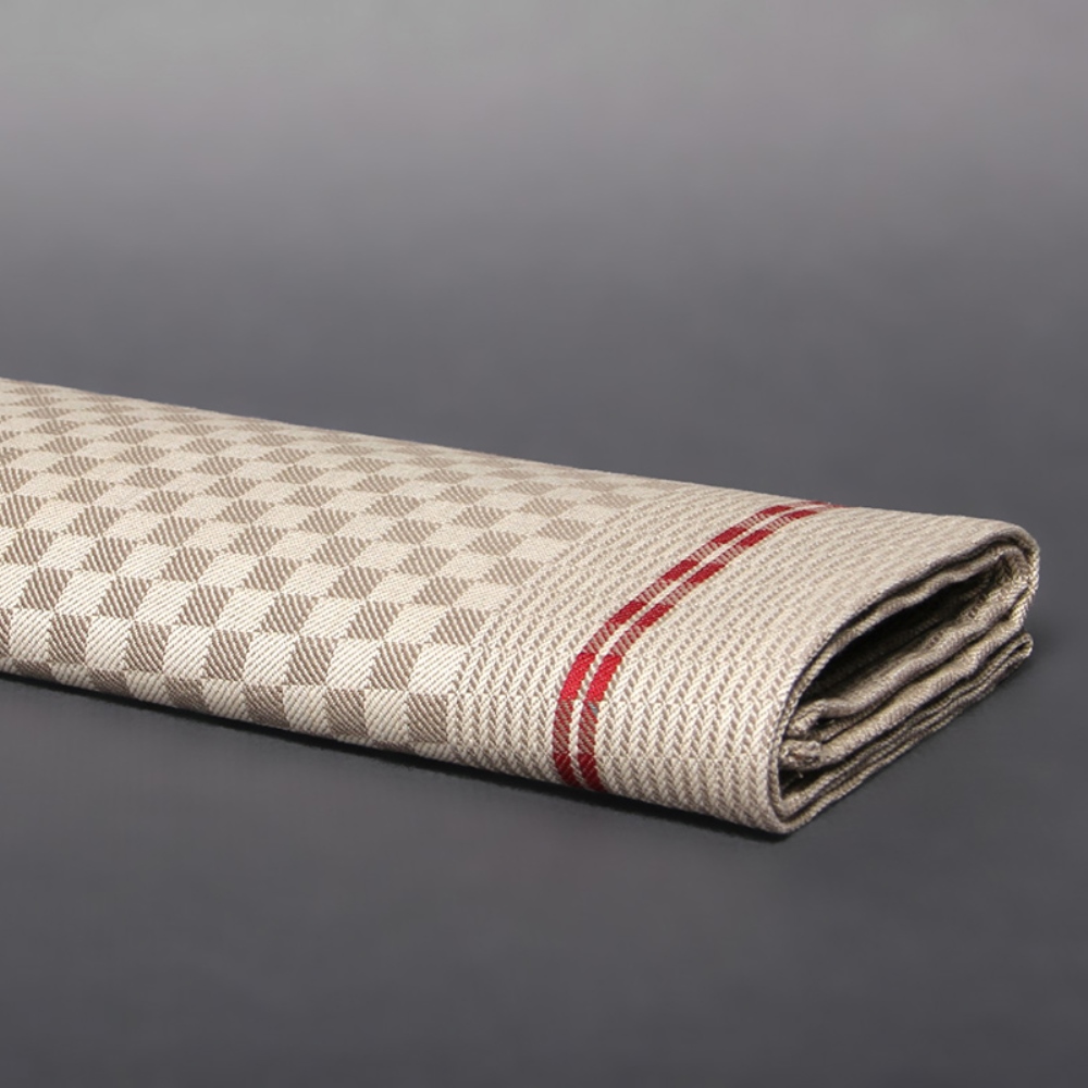 Kökshandduk Alice från Fritz Magnus är tillverkad i naturfärgad bomull med ett klassiskt rutmönster och en dekorativ rand i rött. Den har en rustik, lantlig känsla och fungerar lika fint som servett vid dukningen som som kökshandduk i vardagen. Dessutom har den praktiska hängare på båda kortsidorna för enkel upphängning. Storlek: 50x70 cm.