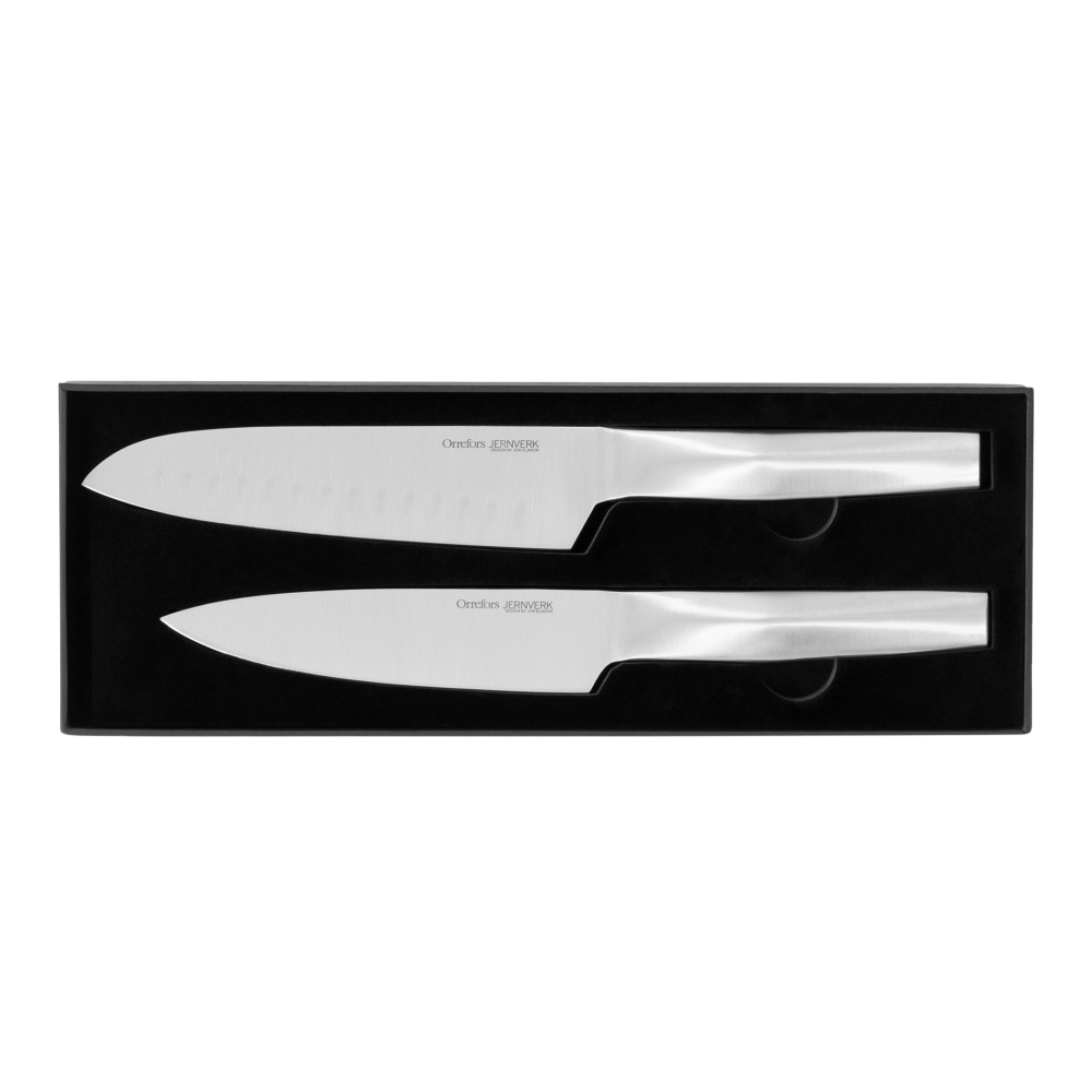 Knivset 2-pack från Orrefors Jernverk designat av Jon Eliason, med genomtänkt grepp för bästa komfort. Setet innehåller en santokukniv och en kökskniv, vilket gör det mångsidigt och perfekt för vardagsmatlagning. De slitstarka bladen erbjuder hög kvalitet och mycket god skärpa, medan den genomtänkta designen ger en exklusiv känsla i köket. Levereras i en elegant presentlåda.