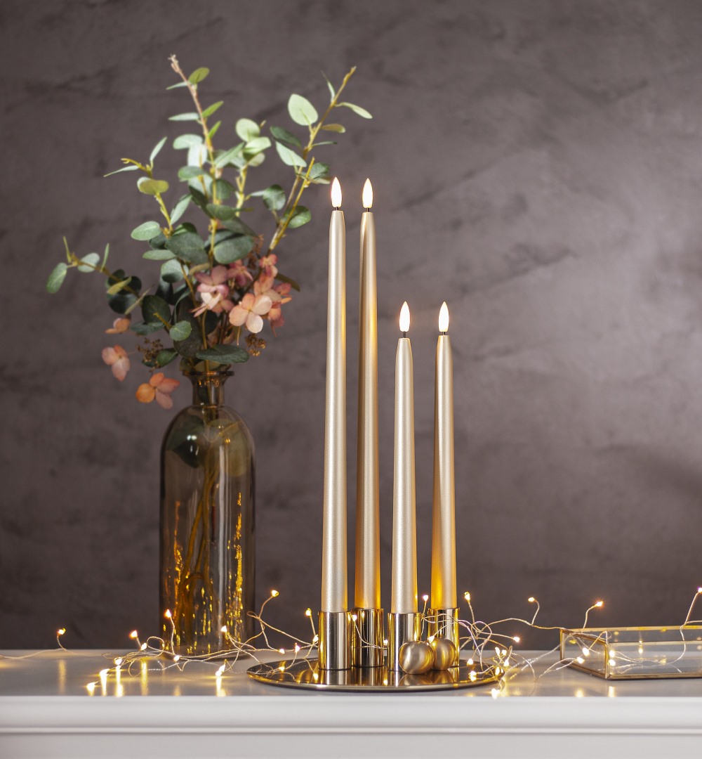 Kronljus LED Flamme Metal från Star Trading i plast med guldskimrande yta som ger ett elegant och dekorativt intryck. Den naturtrogna Flamme-lågan lyser med ett behagligt varmvitt sken och skapar en varm atmosfär. Batteriljuset har en inbyggd timer som enkelt kan ställas in för smidig och bekväm användning. Drivs av 2x2AA batterier, ingår ej. Säljes i 2-pack. Höjd 39 cm.