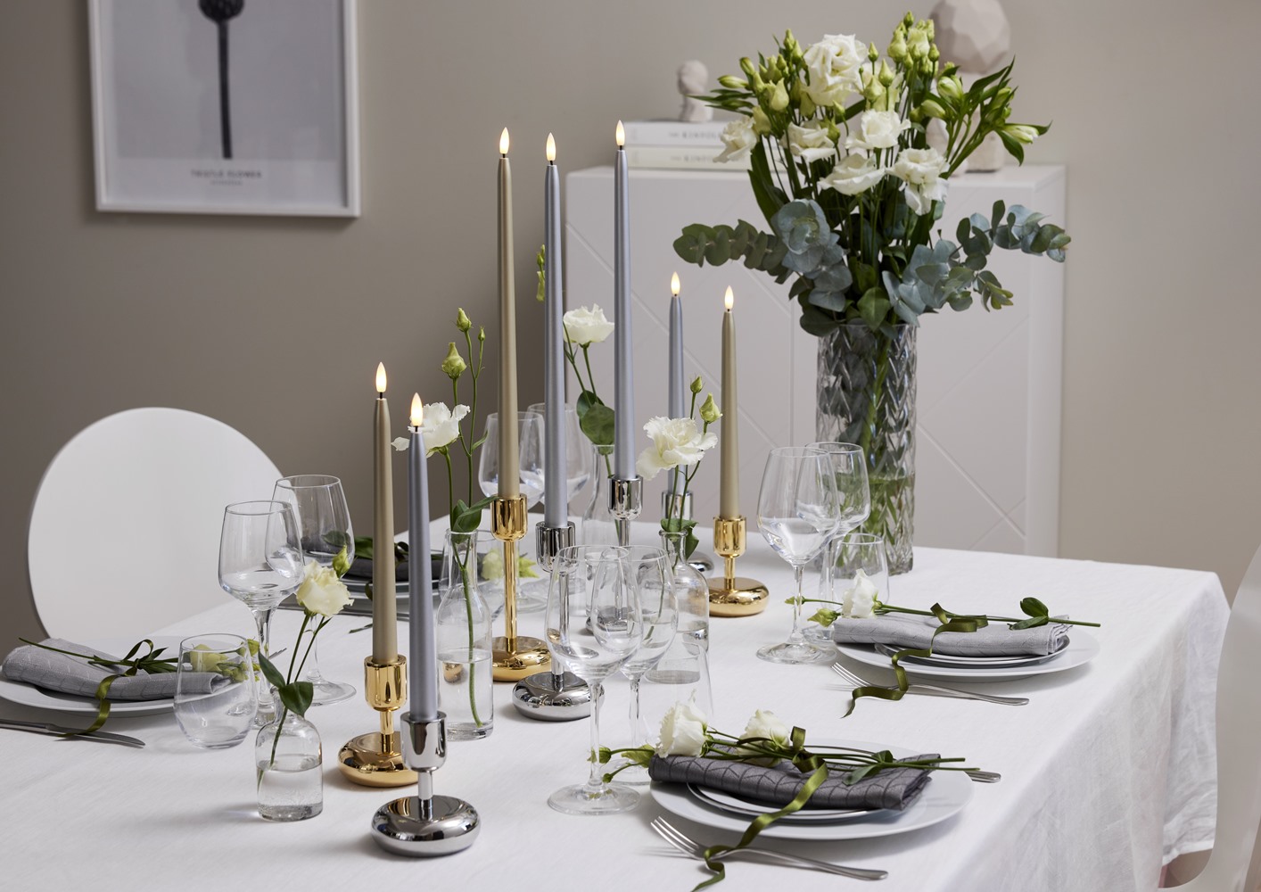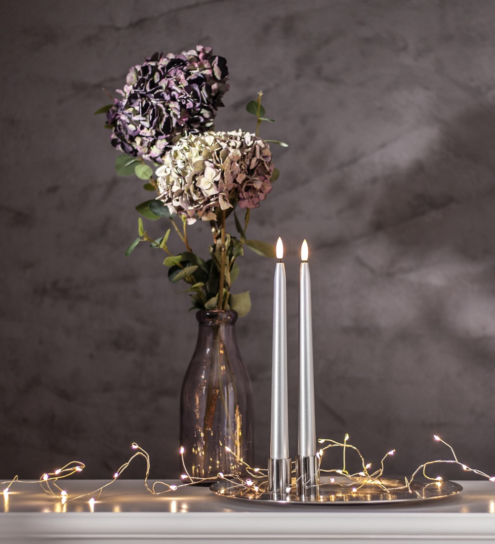Kronljus LED Flamme Metal från Star Trading i plast med en silverskimrande yta som ger ett elegant och dekorativt intryck. Den naturtrogna Flamme-lågan lyser med ett behagligt varmvitt sken och skapar en varm atmosfär. Batteriljuset har en inbyggd timer som enkelt kan ställas in för smidig och bekväm användning. Drivs av 2x2AA batterier, ingår ej. Säljes i 2-pack. Höjd 28,5 cm.