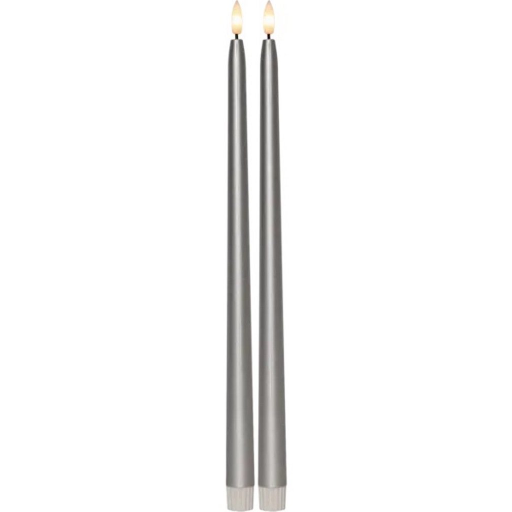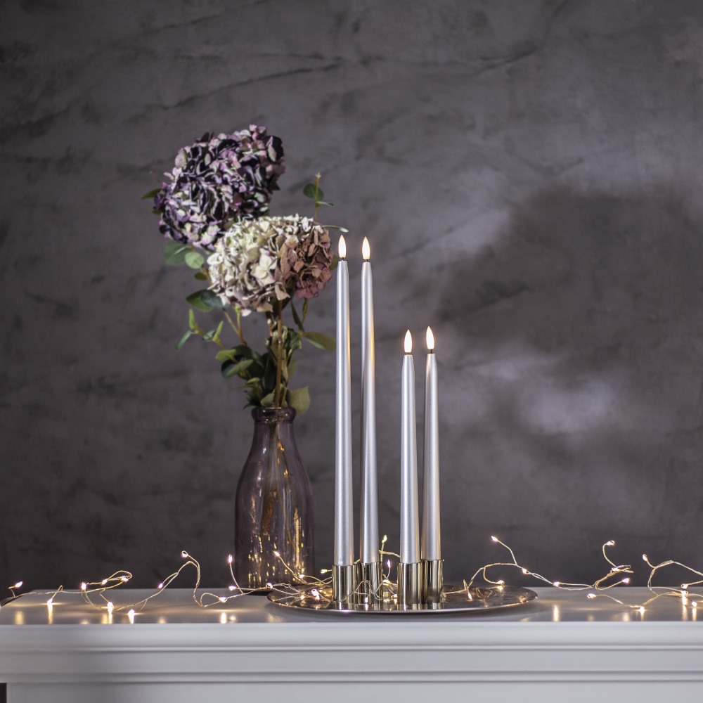 Kronljus LED Flamme Metal från Star Trading i plast med en silverskimrande yta som ger ett elegant och dekorativt intryck. Den naturtrogna Flamme-lågan lyser med ett behagligt varmvitt sken och skapar en varm atmosfär. Batteriljuset har en inbyggd timer som enkelt kan ställas in för smidig och bekväm användning. Drivs av 2x2AA batterier, ingår ej. Säljes i 2-pack. Höjd 39 cm.