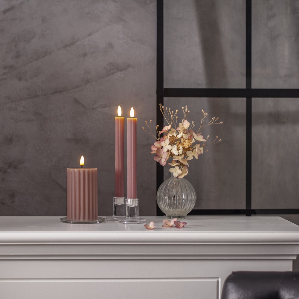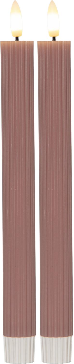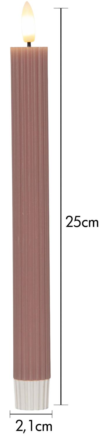 Kronljus LED Flamme Stripe från Star Trading i rosa vax med dekorativ räfflad yta som ger ett elegant uttryck. Den naturtrogna lågan skapar ett mjukt, varmvitt sken och bidrar till en mysig atmosfär. Med inbyggd timer lyser de automatiskt 6 timmar per dag i upp till cirka 30 dagar som är både praktiskt och stämningsfullt. Drivs av 2 AAA-batterier per ljus, ingår ej. Höjd: 25 cm.