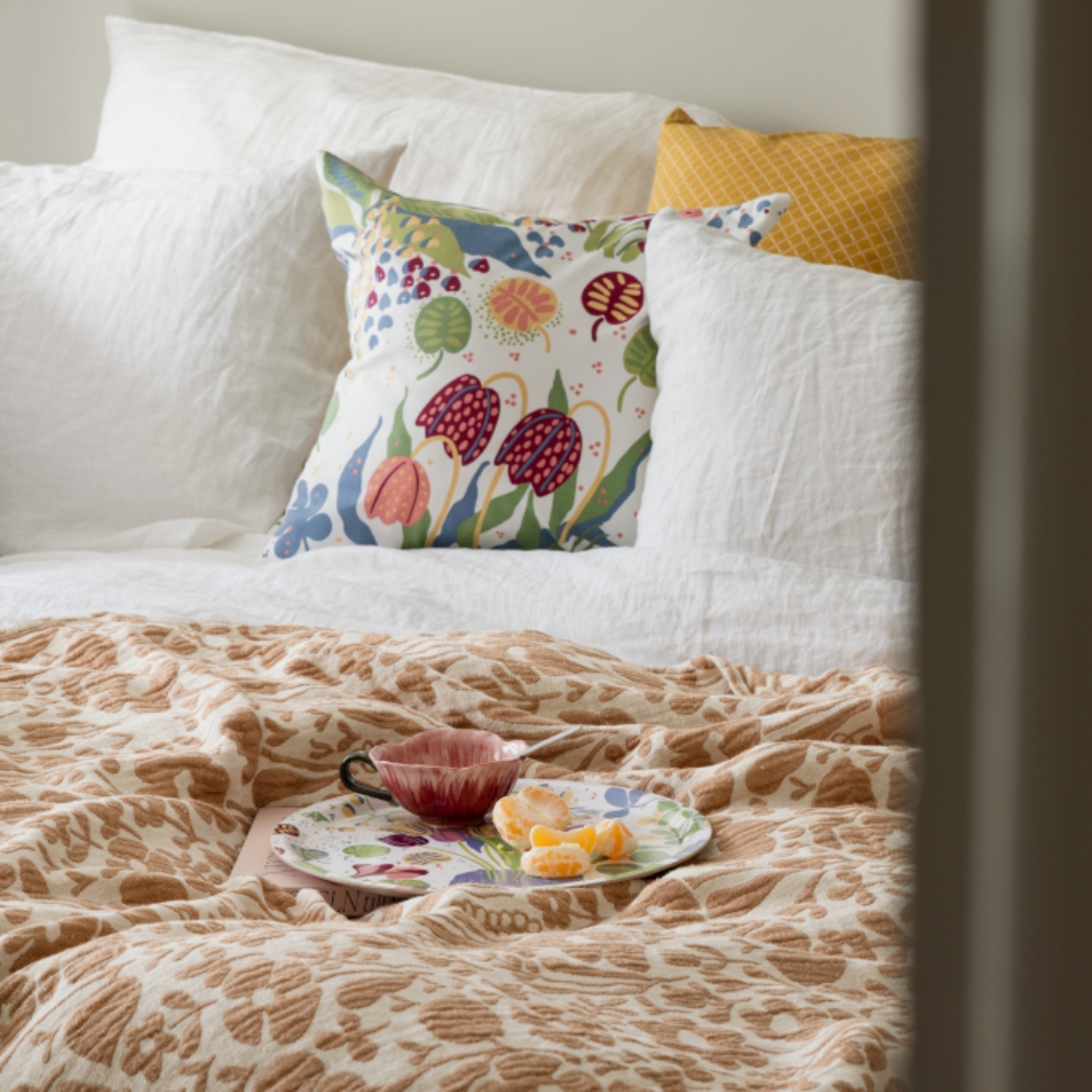 I 100% bomull med tidlöst växtmönster inspirerat av 1970-talet. Skapar en lätt och livfull känsla, perfekt för vardagsrum och sovrum.