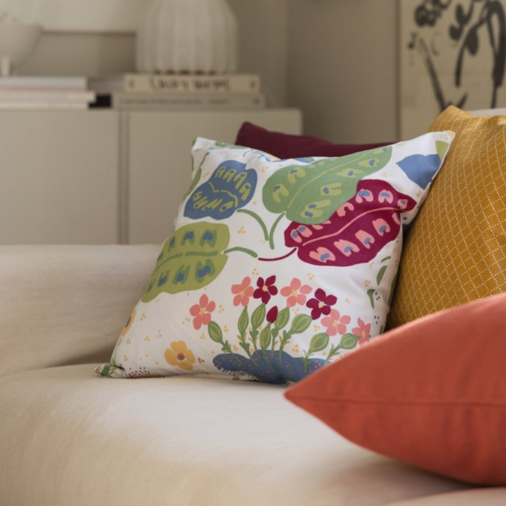 Kuddfodral Ailanthus från Almedahls är tillverkat i 100% bomull och har ett tidlöst mönster med inspiration från 1970-talet. Mönstret, formgivet av Louise Fougstedt Carling, är inspirerat av gudaträdet och kännetecknas av slingrande växtformer och blad i ljusa, naturliga toner som skapar ett lätt och livfullt uttryck i rummet.