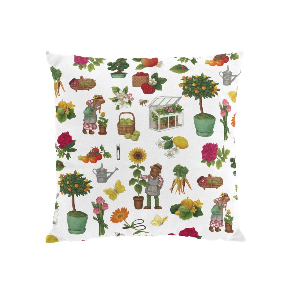 Kuddfodral Gräv & Gro från Arvidssons Textil i bomull har en charmig design som skildrar livet i trädgården. Här syns trädgårdsmästare bland solrosor och krukväxter, små växthus fyllda med plantor samt skördar av morötter, tomater och jordgubbar. Bland motiven finns även klassiska trädgårdsredskap som vattenkannor och sekatörer, tillsammans med rosor och fjärilar.