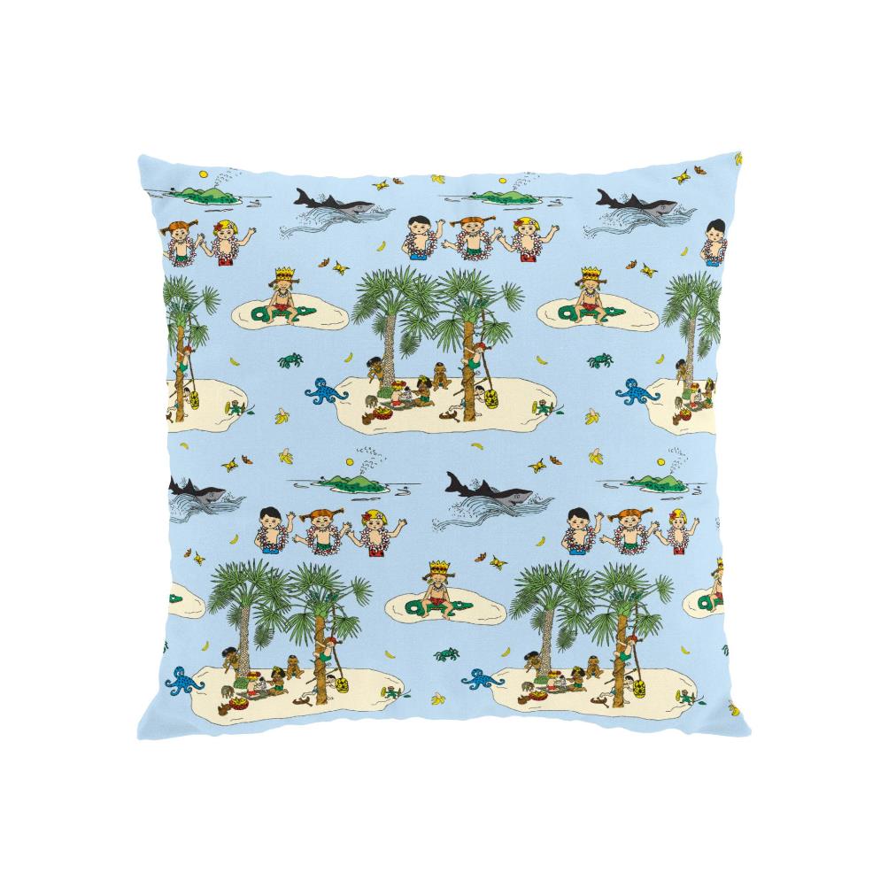 Kuddfodral Kurrekurreduttön från Arvidssons Textil i bomull har ett lekfullt och äventyrligt motiv inspirerat av Pippis värld. Här möter du Tommy och Annika bland öar, hajar och palmer mot en blå botten som för tankarna till spännande äventyr.