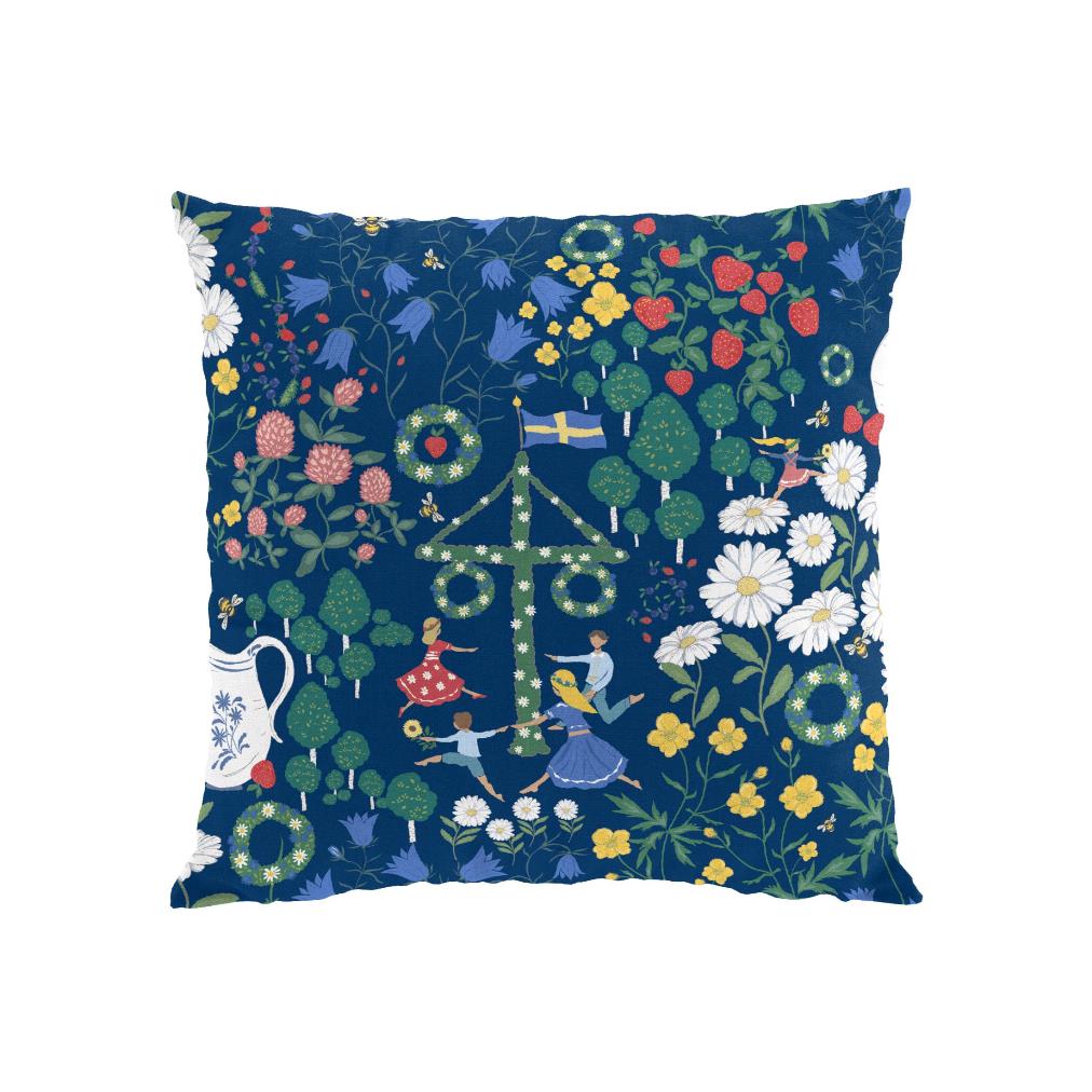 Kuddfodral Midsommardans från Arvidssons Textil har en charmig design inspirerad av ett klassiskt midsommarfirande i en fin sommarmiljö. Motivet visar klädda midsommarstänger och dansande människor i sommarkläder mot en blå botten som för tankarna till ljusa sommardagar.