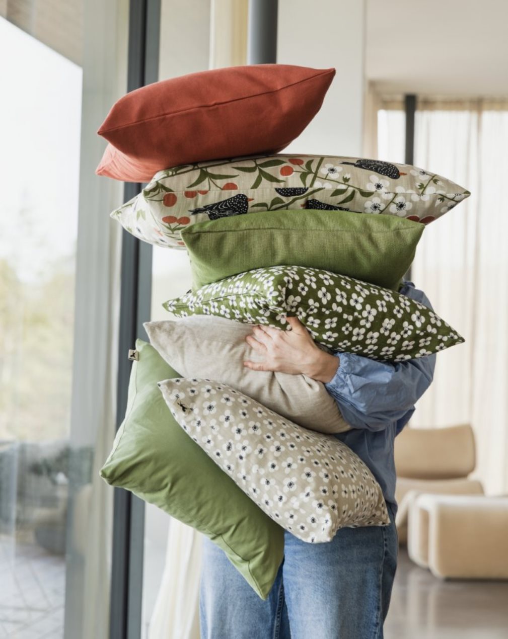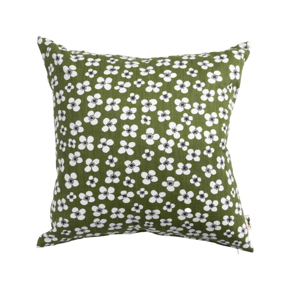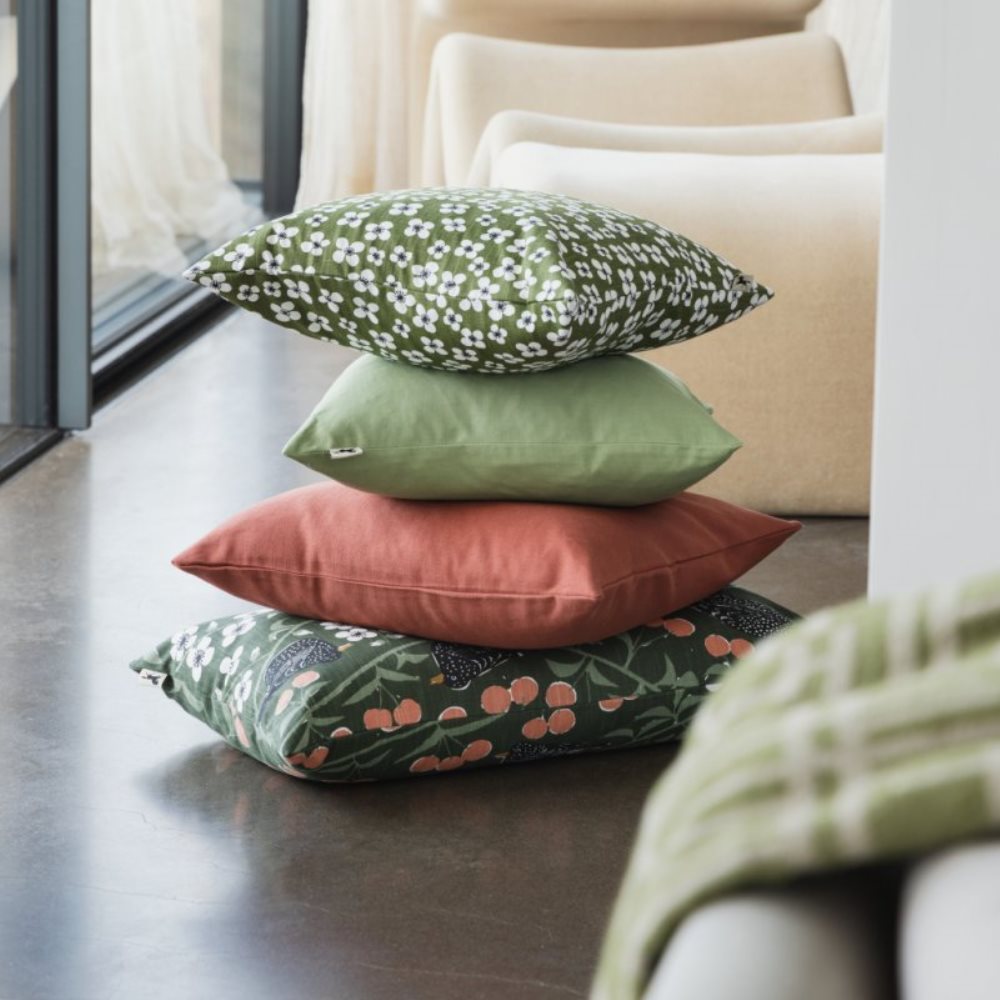 Kuddfodral Belle Amie, 47x47 cm, från Almedahls har vita blommor på en mörkgrön botten och skapar ett mjukt, harmoniskt och tidlöst intryck i soffan. Det mjuka, virvlande blomstertrycket bygger på Marianne Westmans originaldesign Körsbärsträdgården, där körsbärsblommorna står i fokus. Den beige färgskalan känns både modern och hemtrevlig – en perfekt detalj som för in svensk designhistoria i hemmet.