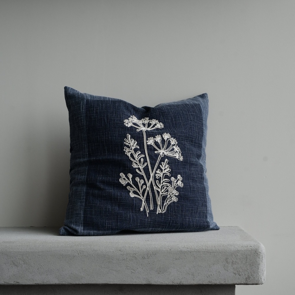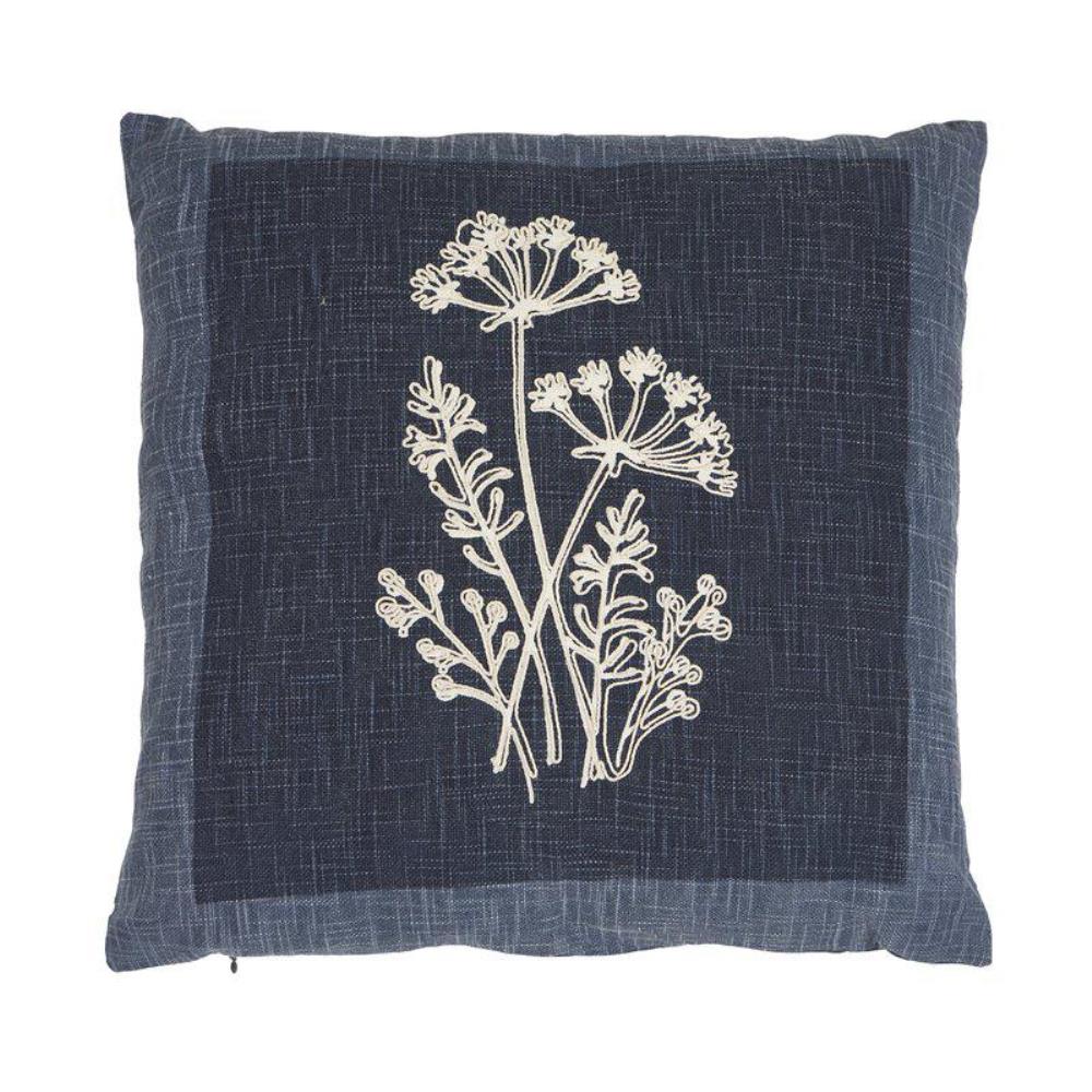 Kuddfodral Laura från Fondaco i grov bomullsslub med en blå framsida som har ett tryckt mönster i botten och ett vackert ljust broderi ovanpå. Det ger både djup och en fin hantverkskänsla. Baksidan är enfärgad, vilket gör kuddfodralet lätt att kombinera med andra kuddar. Perfekt för dig som vill skapa en ombonad, naturlig och stilren inredning med textilier i jordnära toner. Storlek: 48x48 cm.