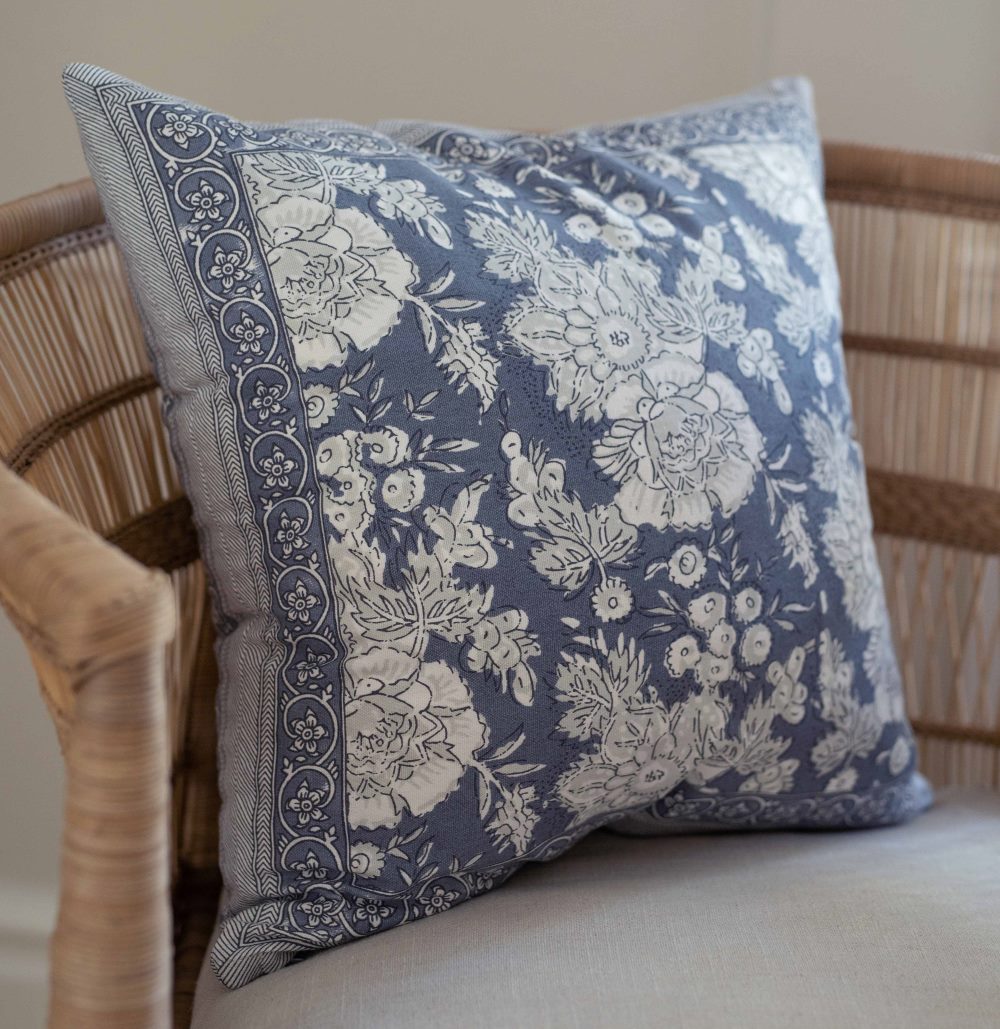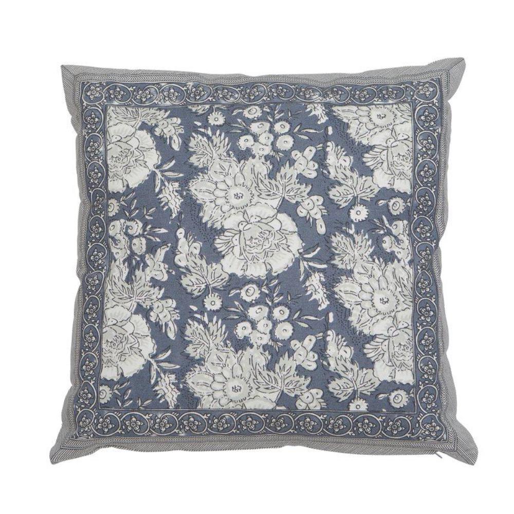 Kuddfodral Sonia från Fondaco har ett romantiskt blommönster i klassisk stil, vackert inramat av en dekorativ bård som ger designen en elegant finish.