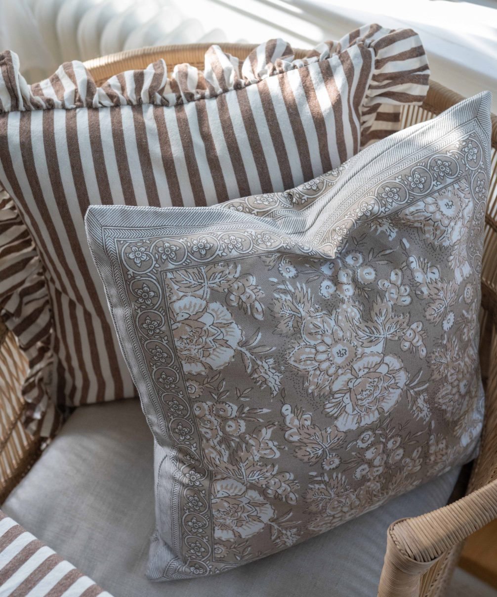Kuddfodral Sonia från Fondaco har ett romantiskt blommönster i klassisk stil, vackert inramat av en dekorativ bård som ger designen en elegant finish.
