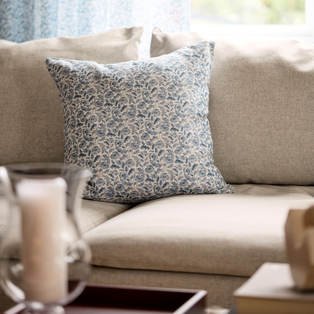 Kuddfodralet Yrsa 45x45 cm från Svanefors har ett vackert småblommigt mönster med blå blommor och blad på en ljus botten, vilket skapar en lugn och harmonisk känsla i rummet. Ett stilfullt tillskott till soffan, fåtöljen eller sängen som passar lika bra i det klassiska som det moderna hemmet. Dragkedja i nederkant