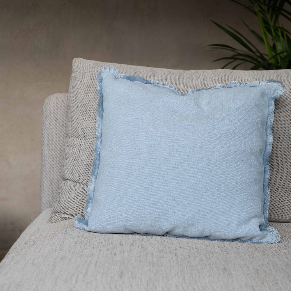 Kuddfodral Danny från Fondaco i en fin ljusblå nyans som ger rummet ett mjukt och harmoniskt uttryck. Den subtila lystern i tyget skapar ett exklusivt och inbjudande intryck, medan den nätta fransen runtom tillför en trendig och sofistikerad känsla.