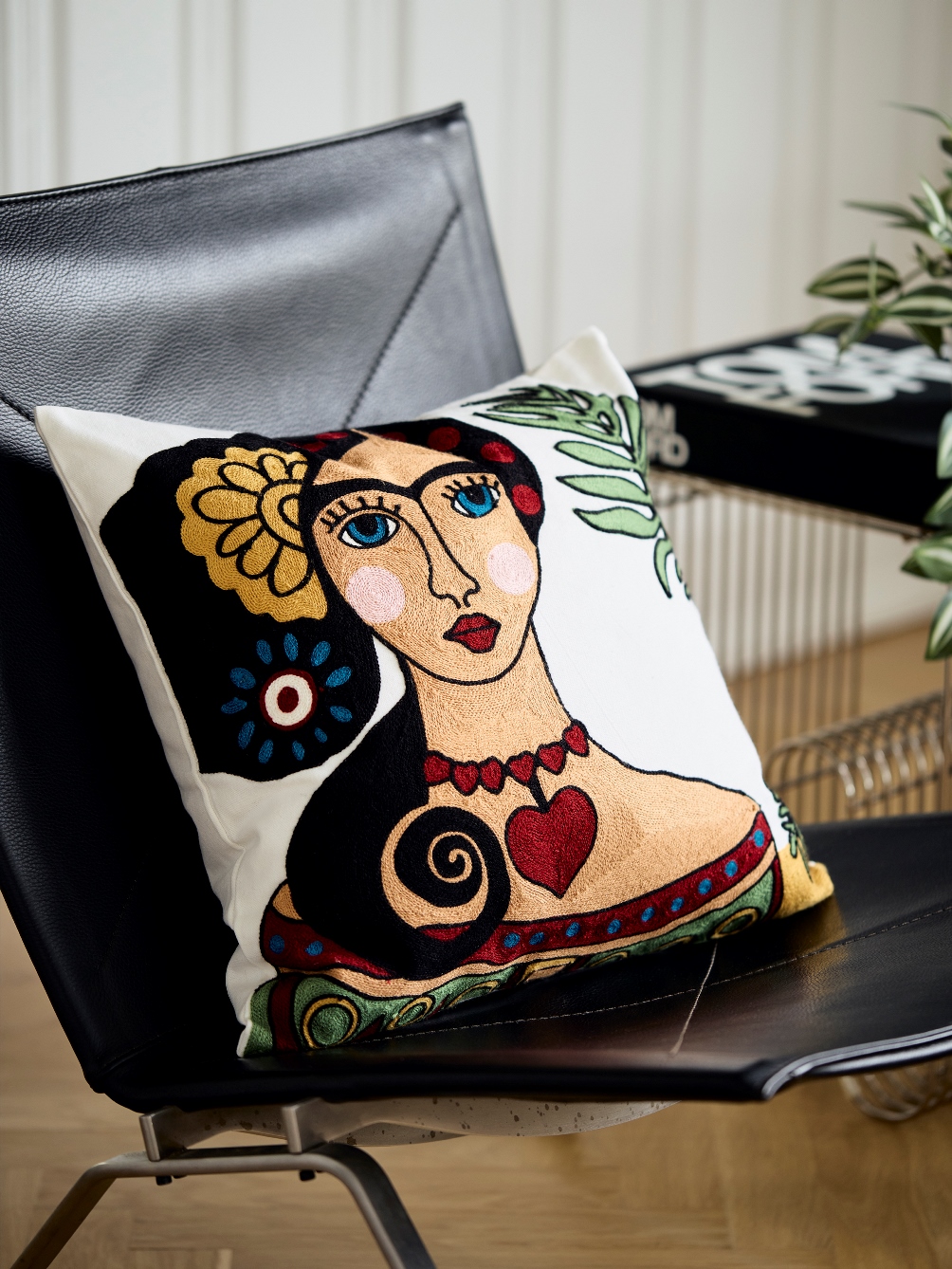 Kuddfodral Frieda 45x45 cm från Svanefors har ett färgstarkt motiv av ett kvinnoporträtt i grafisk stil. Designen domineras av klara nyanser av rött, gult, grönt, svart och beige mot en vit bakgrund. Ett uttrycksfullt och konstnärligt inslag som tillför personlighet och färg till både soffa och säng. Dragkedja i nederkant.