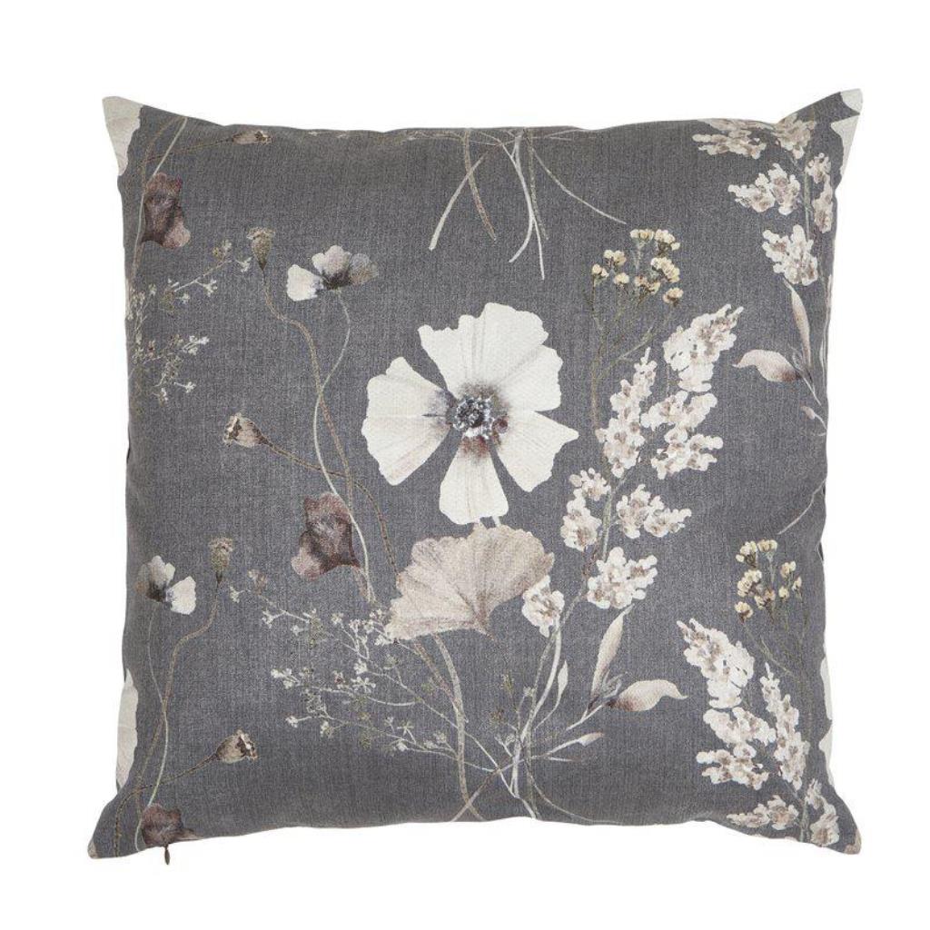 Kuddfodral Sabine från Fondaco med ett livfullt blommönster på en grå framsida som är tillverkat i en mjuk och behaglig kvalitet. Den enfärgade baksidan ger en fin balans mellan mönster och enkelhet. Perfekt för att skapa en ombonad och harmonisk känsla i rummet. Storlek: 48x48 cm.