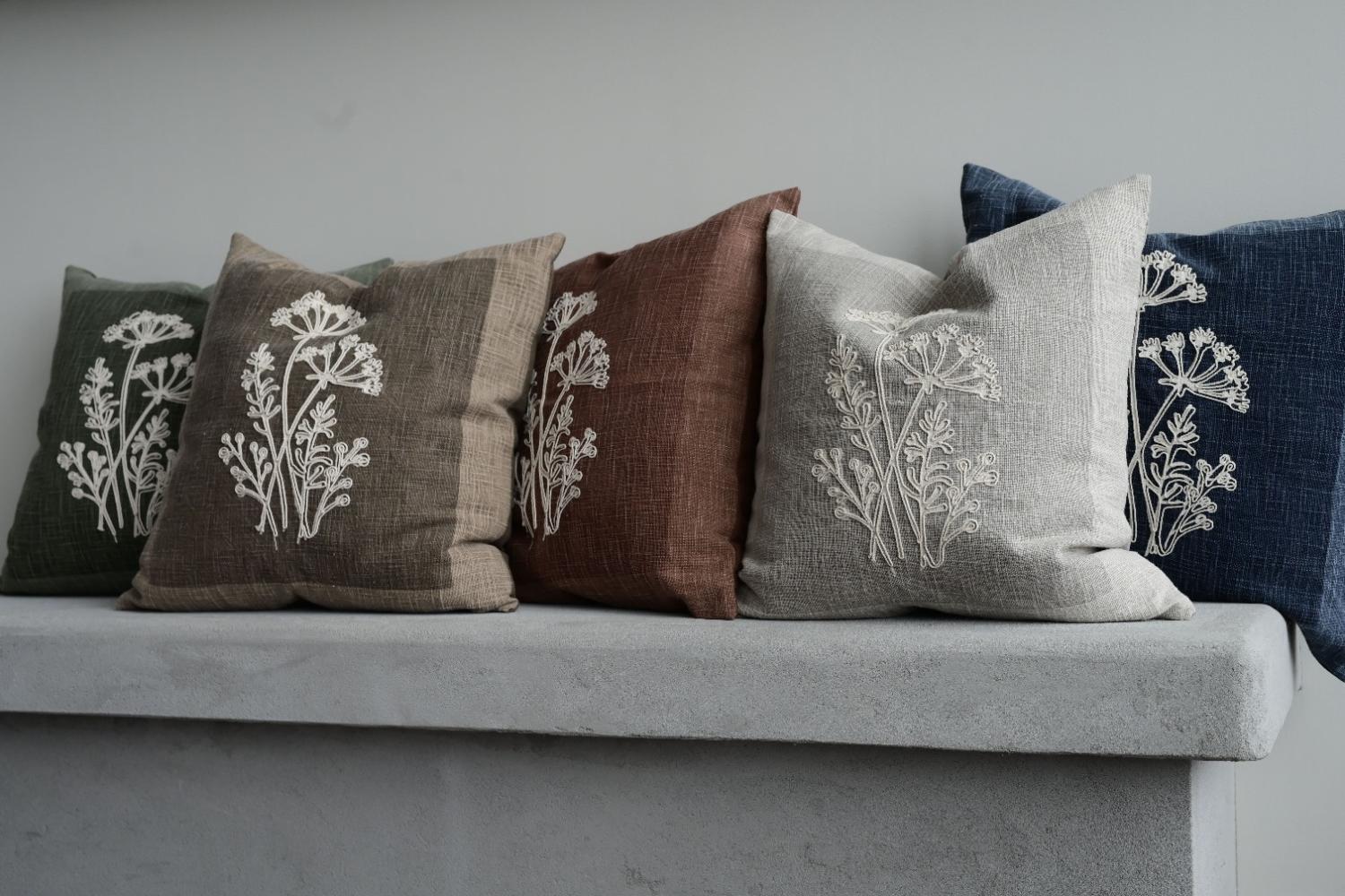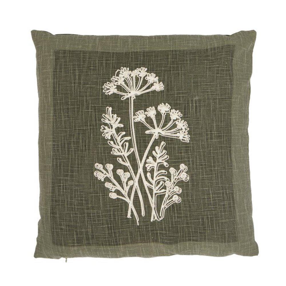 Kuddfodral Laura från Fondaco i grov bomullsslub med en grön framsida som har ett tryckt mönster i botten och ett vackert ljust broderi ovanpå. Det ger både djup och en fin hantverkskänsla. Baksidan är enfärgad, vilket gör kuddfodralet lätt att kombinera med andra kuddar. Perfekt för dig som vill skapa en ombonad, naturlig och stilren inredning med textilier i jordnära toner. Storlek: 48x48 cm.