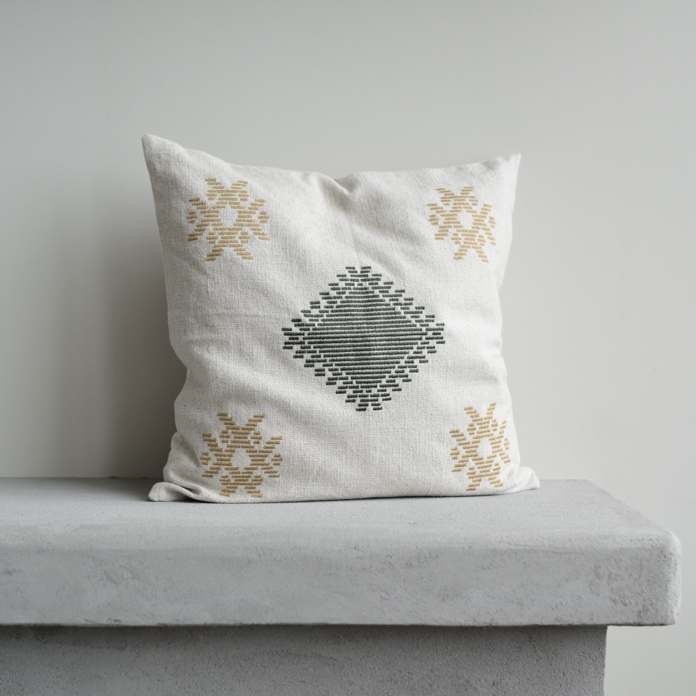 Kuddfodral Ike från Fondaco i en vacker blandning av bomull och linne – en kombination som ger en naturlig och något rustik känsla med en sofistikerad touch. Den mjuka bomullen möter linets tydliga struktur och skapar en fin balans mellan komfort och karaktär. Det broderade mönstret tillför ett stilrent uttryck och en handgjord känsla som lyfter inredningen. Storlek: 50x50 cm.