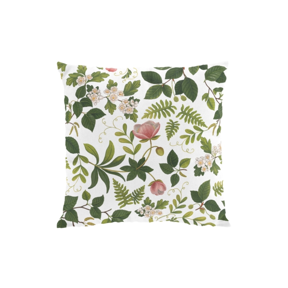 Kuddfodral Blomsterlund från Arvidssons Textil, tillverkad i 100% bomull med ett vackert mönster av blommor och gröna blad på en ljus botten. Kuddfodralet ger ett inbjudande och trivsamt intryck och passar perfekt i både vardagsrummet och sovrummet, där det skapar en härlig och naturlig atmosfär. Design: Mialotta Arvidsson Mars. Storlek: 47x47 cm.